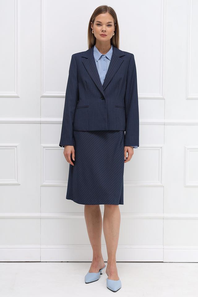 Эта юбка от Gerry Weber станет отличным дополнением к вашему гардеробу. Модель выполнена в синем цвете с вертикальной полоской, что визуально вытягивает силуэт.