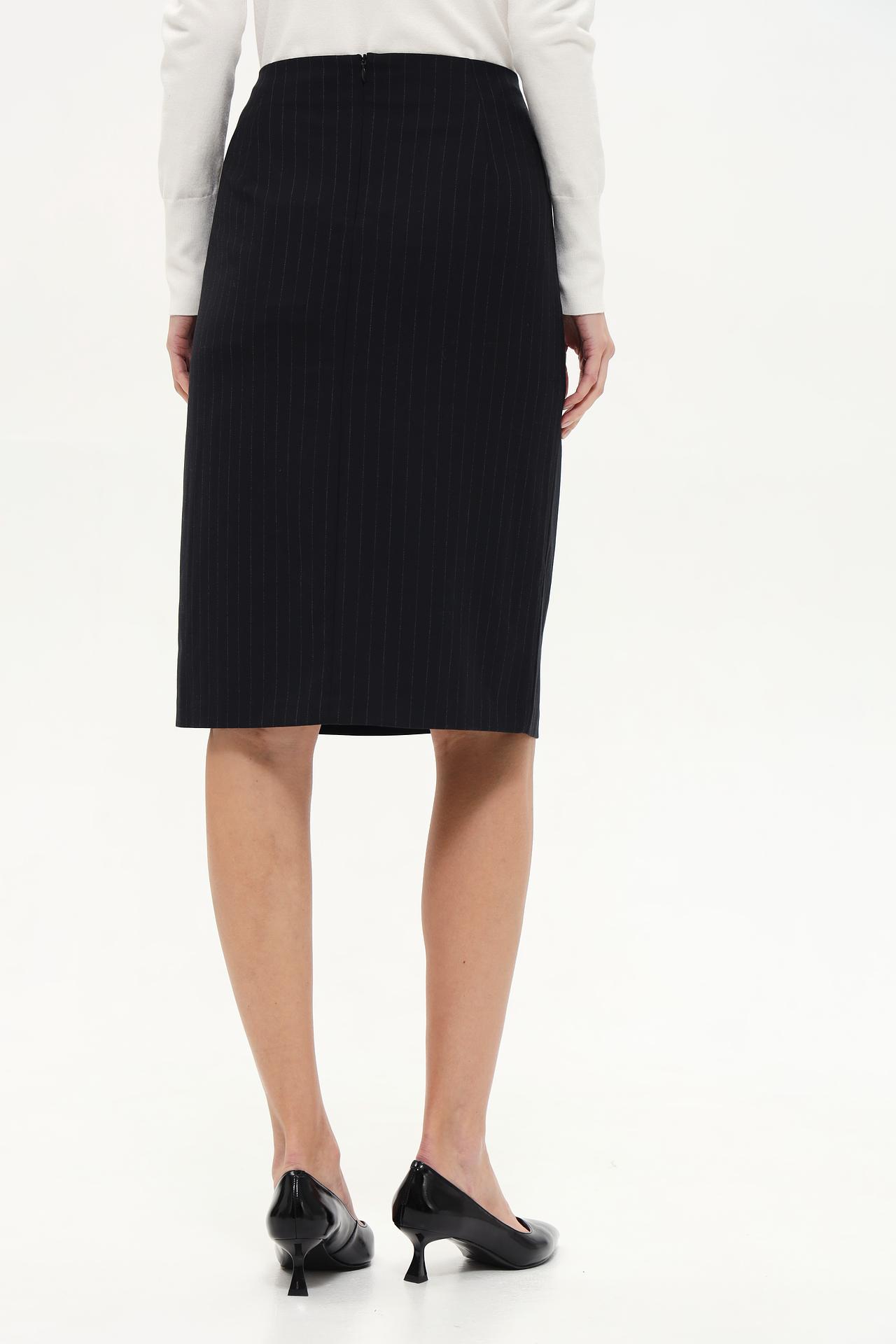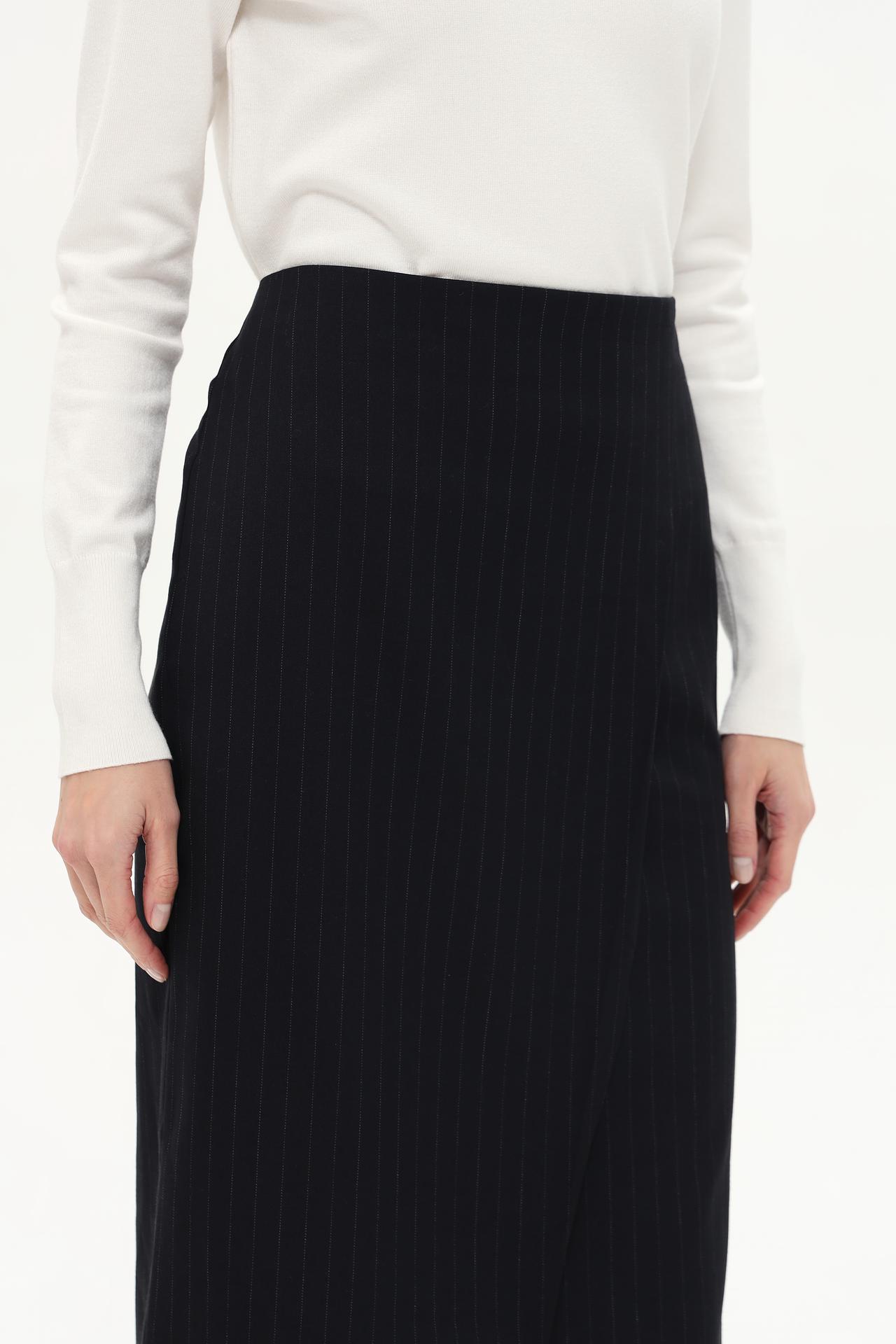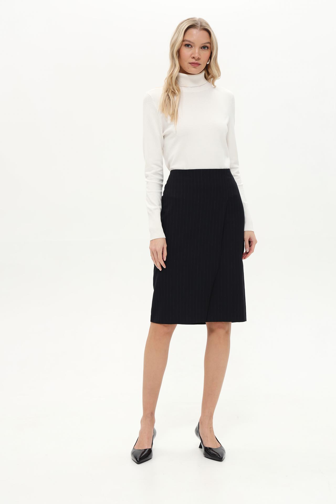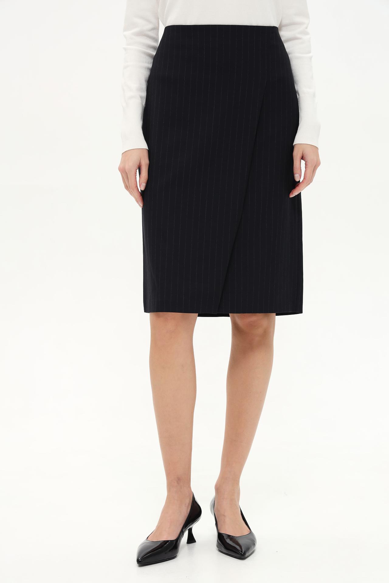 - Дизайн: Юбка-карандаш с запахом выполнена в классическом черном цвете с мелкой вертикальной полоской. Такой дизайн универсален и подходит для любого типа фигуры, создавая элегантный и строгий образ.