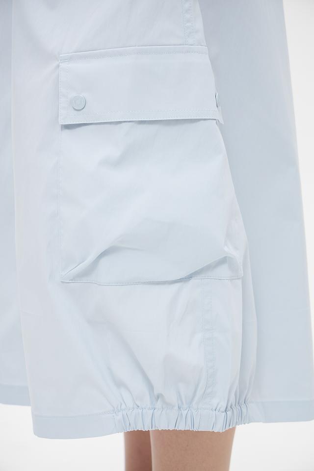 Модель имеет длину миди и свободный крой, обеспечивающий комфорт при движении. Удобный пояс на шнуровке позволяет регулировать посадку по фигуре. Наличие накладных карманов добавляет практичности и функциональности.