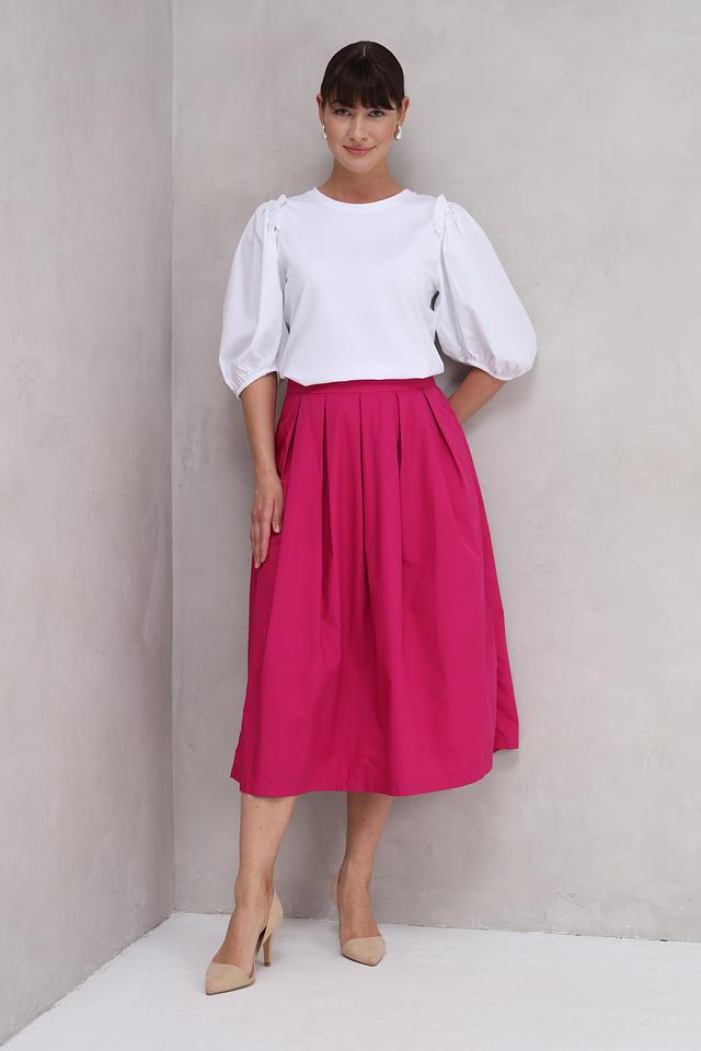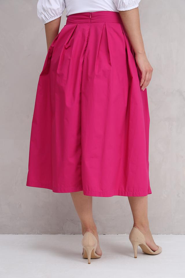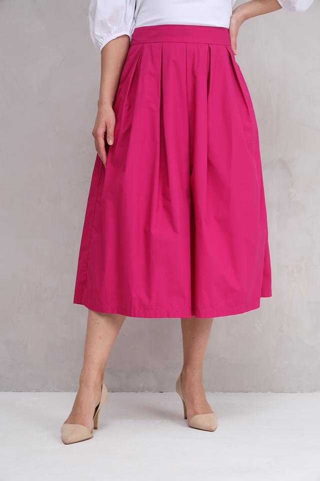 Яркий фуксиевый цвет и плиссированная фактура делают эту юбку отличным выбором для создания стильных и запоминающихся образов. Модель имеет классическую длину миди и удобную посадку по фигуре.
