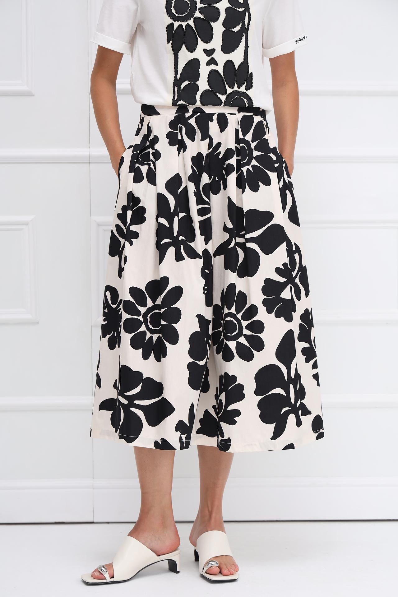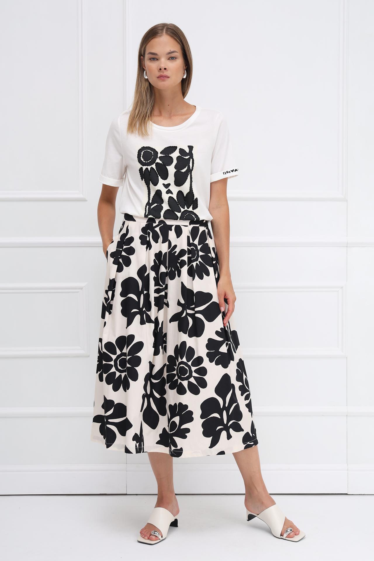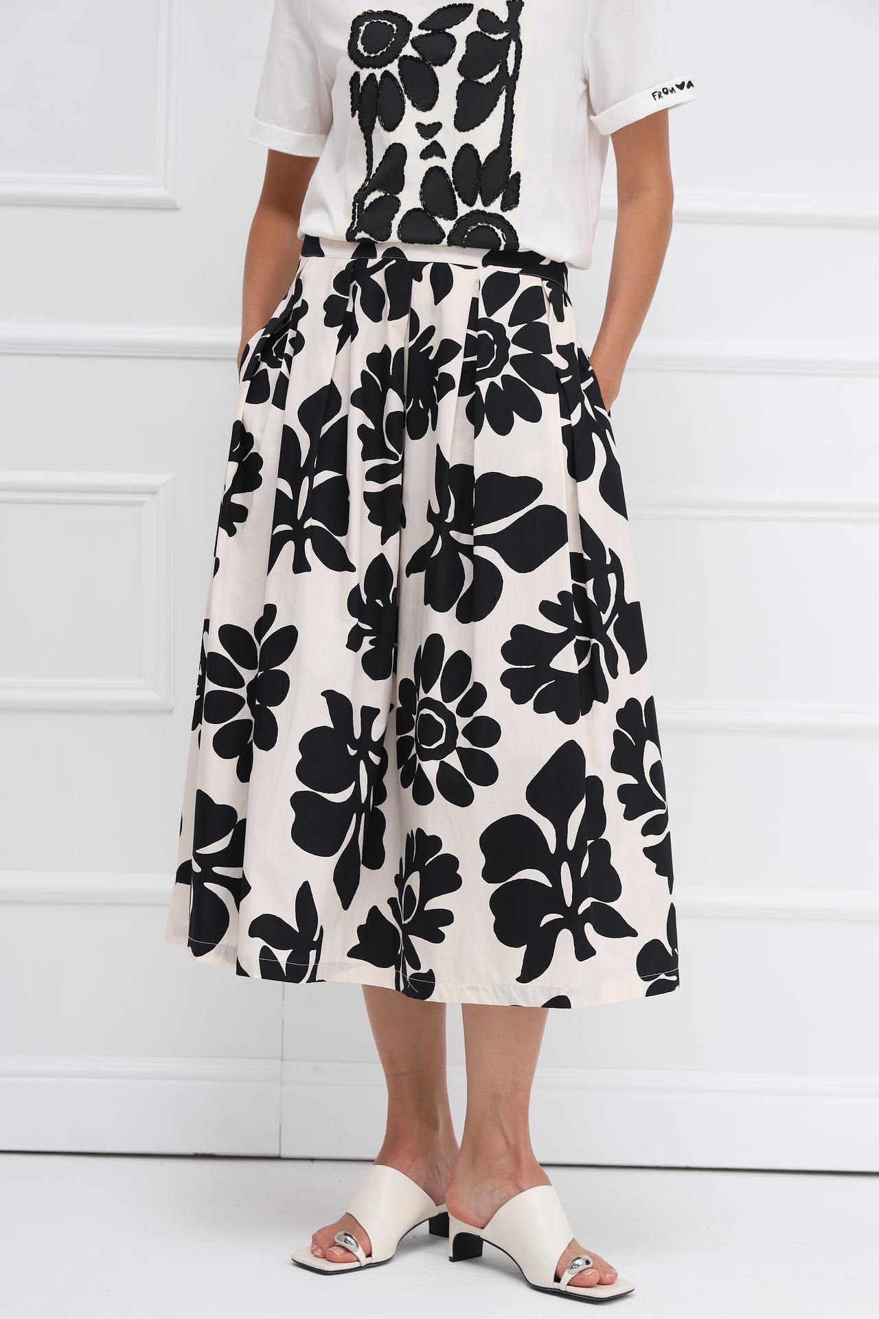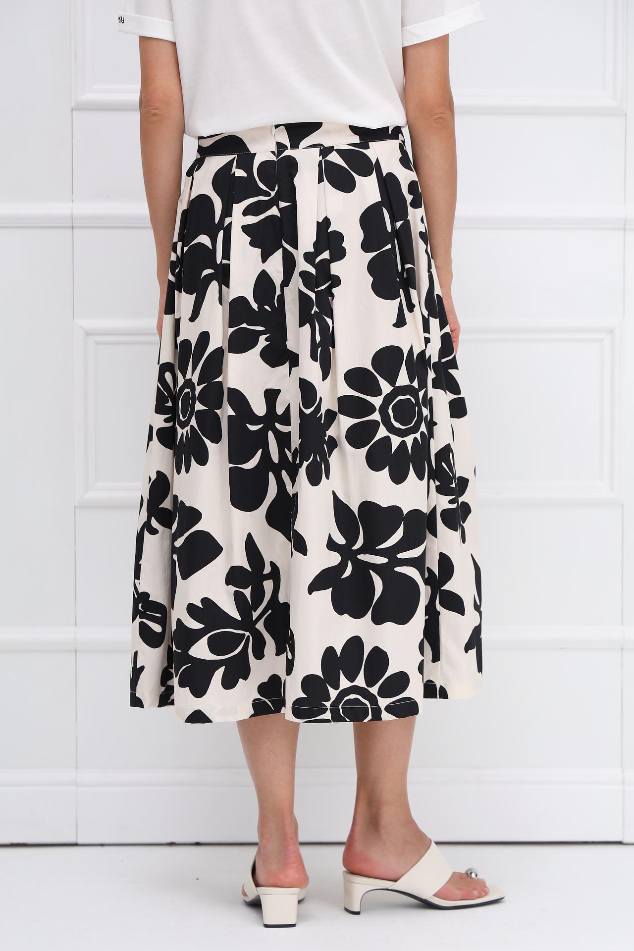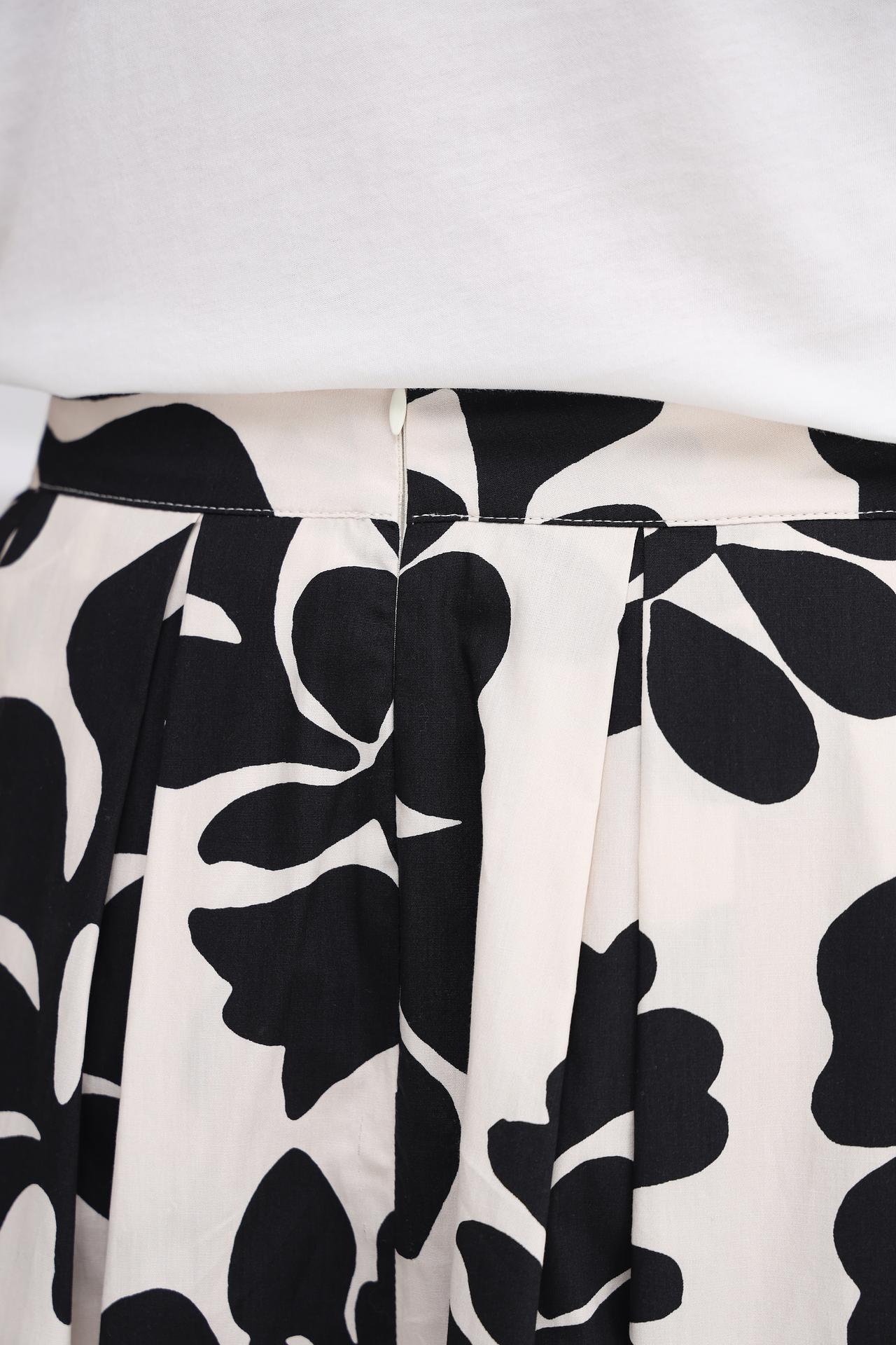 - Элегантный дизайн: Классический фасон юбки миди дополнен выразительным чёрным цветочным узором на белом фоне. Скрытая молния на спине и аккуратные плиссировки придают изделию утонченный вид.