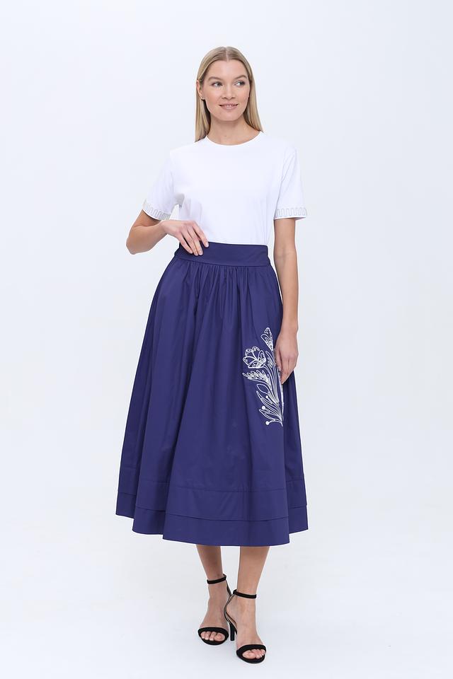 Синяя юбка Pezzo из хлопка с цветочной вышивкой – стильное и комфортное решение для создания женственного образа. Юбка имеет длину миди и удобную посадку. Состав: хлопок 100%