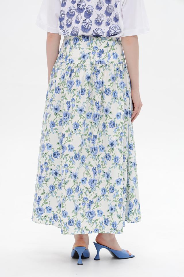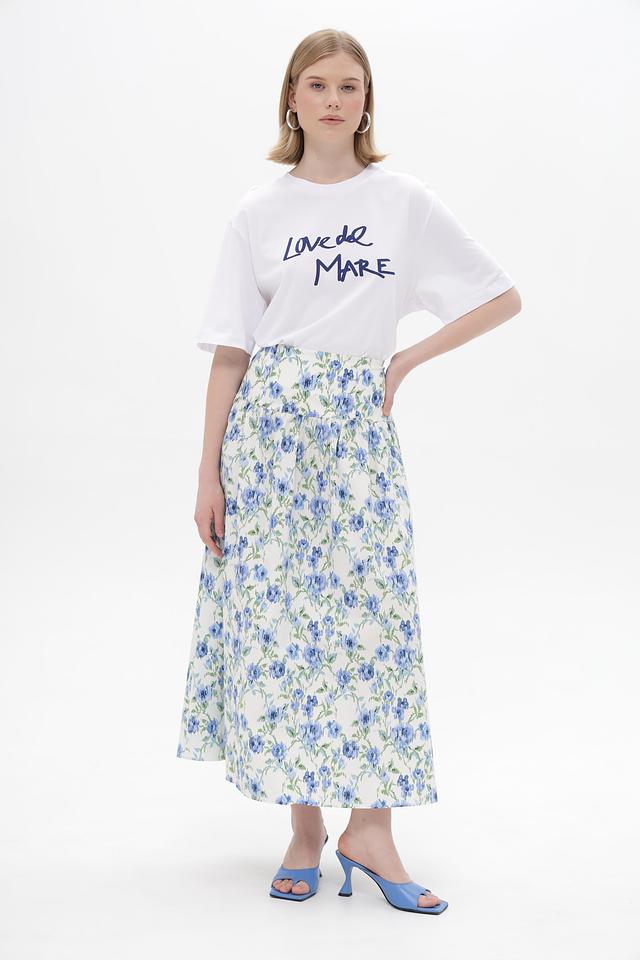Юбка имеет длину миди и свободный крой, который не сковывает движений. Основной цвет – белый, украшенный мелким цветочным принтом в голубых тонах. Эластичный пояс обеспечивает удобную посадку по фигуре.
