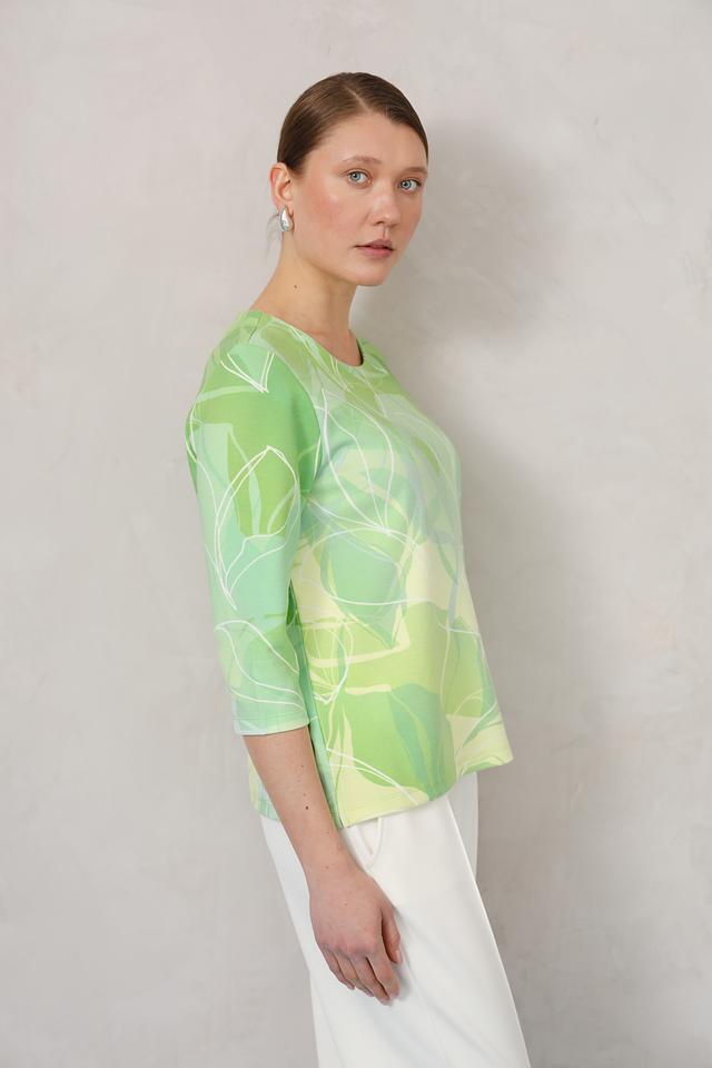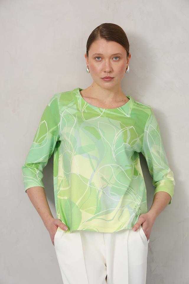 Пуловер имеет свободный крой и короткие рукава, что делает его идеальным для теплой погоды. Его основной цвет – лайм, украшенный ярким и необычным принтом в виде листьев. Такой рисунок добавляет образу свежести и оригинальности.