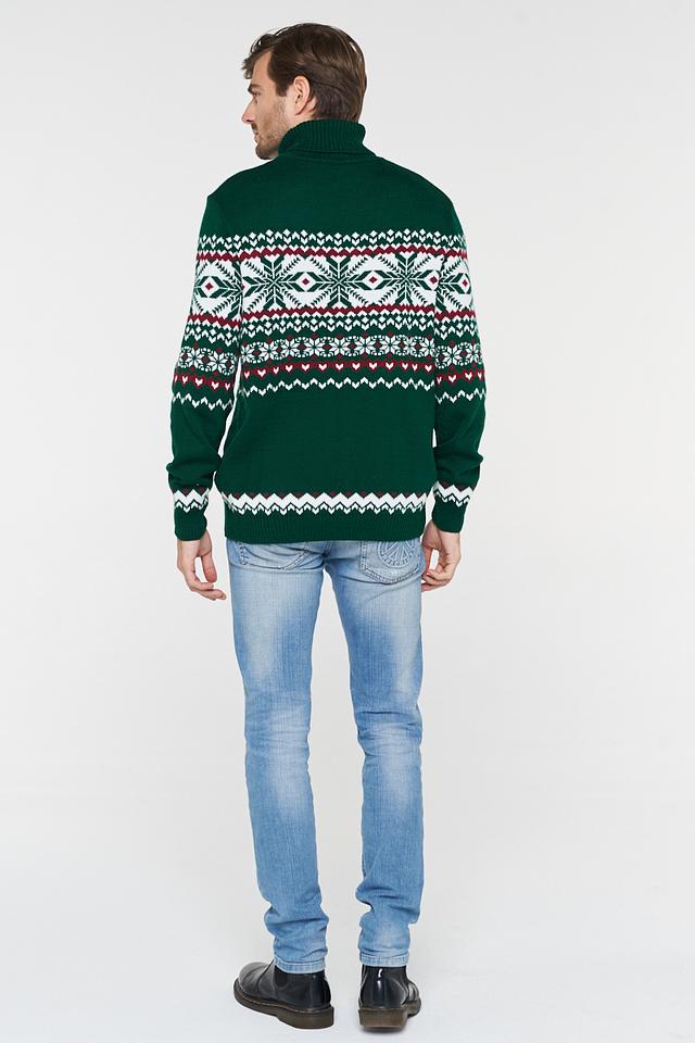 Основной цвет пуловера – насыщенный зелёный, который гармонично сочетается с ярким жаккардовым узором, выполненным в белых, красных и бежевых тонах. Узор представляет собой традиционный геометрический орнамент, придающий изделию особый шарм.