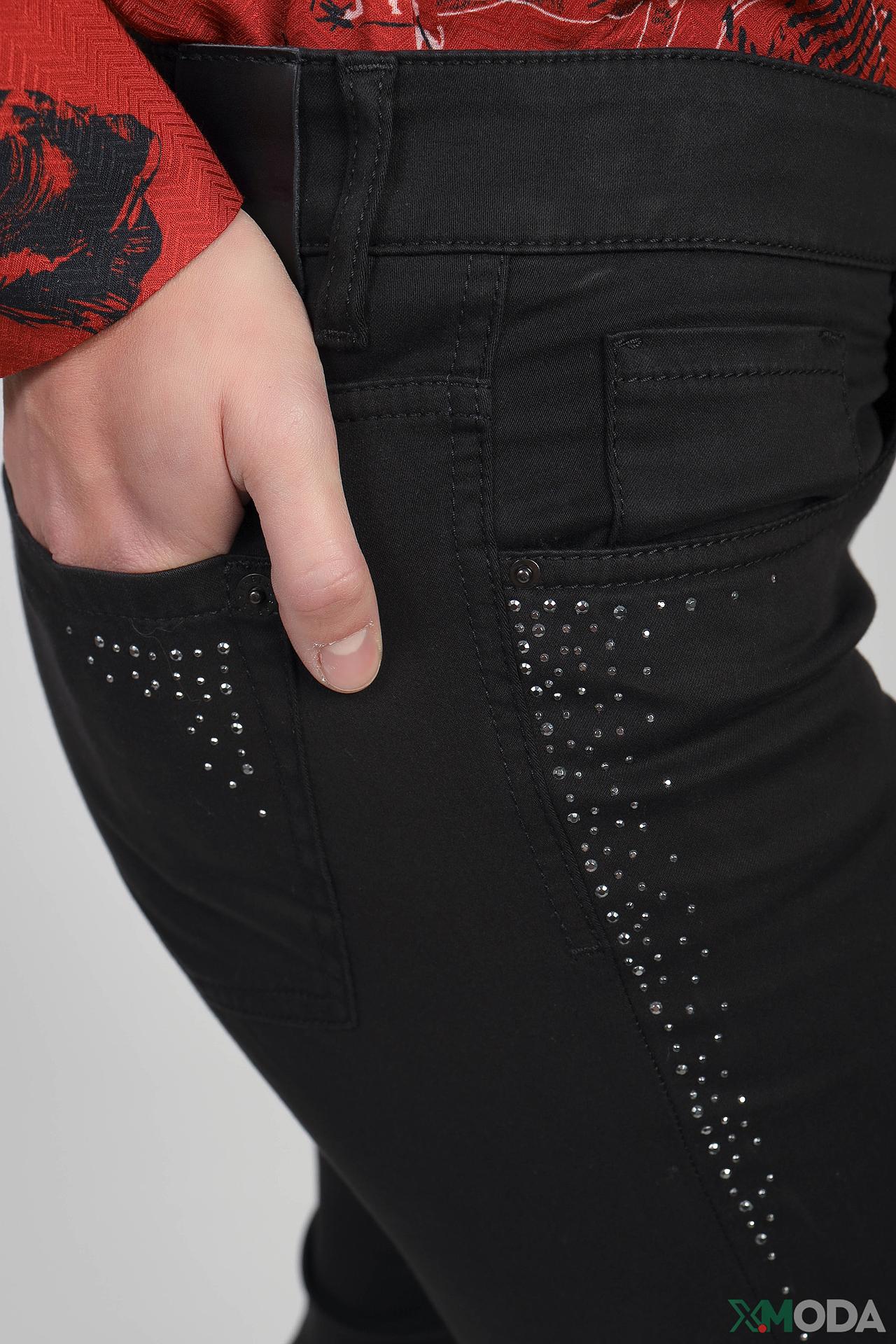 - Дизайн: Классический крой с пятью карманами. Декоративные элементы в виде страз на задних карманах придают модели элегантность и уникальность.