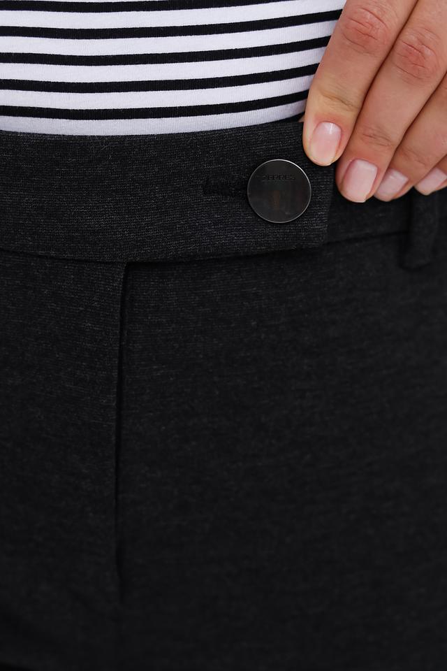 Брюки имеют прямой крой, стандартную посадку по талии и застёжку на пуговицу. Ткань, состоящая из вискозы, полиамида и эластана, обеспечивает комфорт в носке и приятные тактильные ощущения.