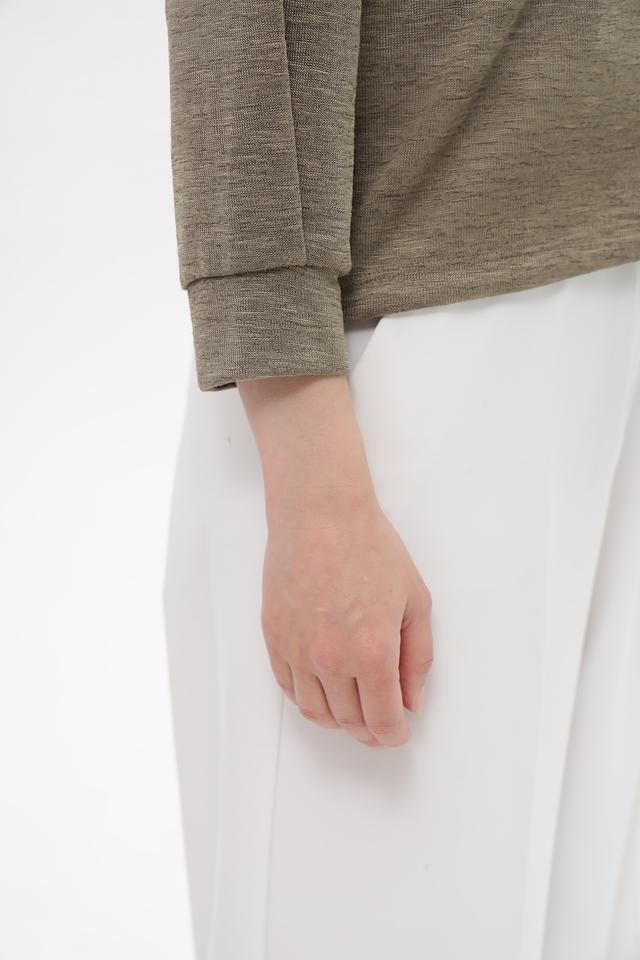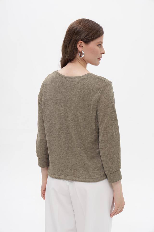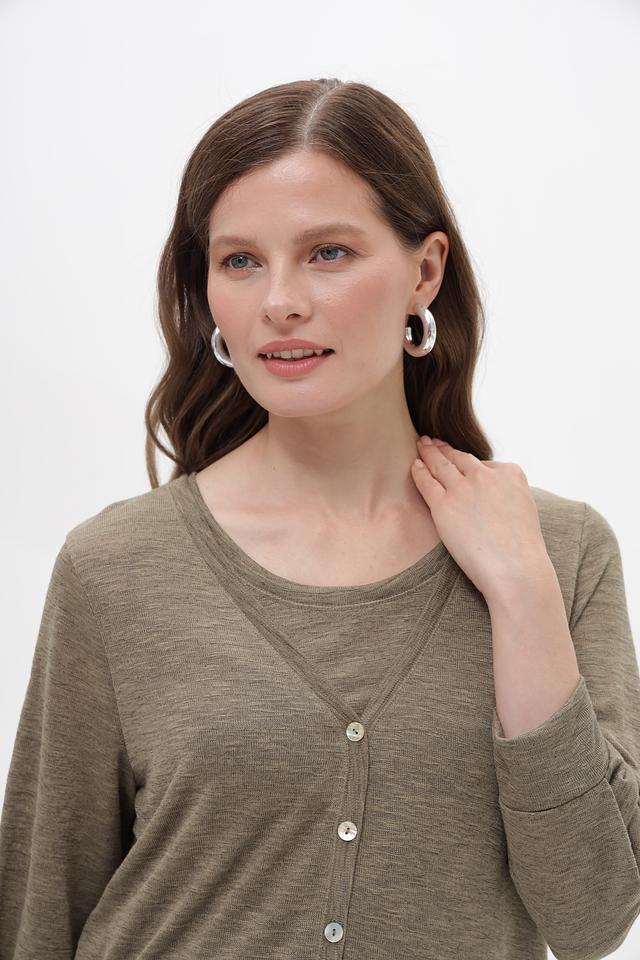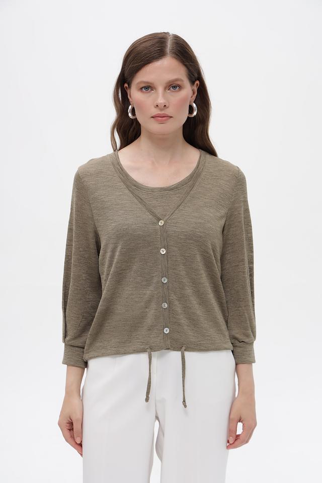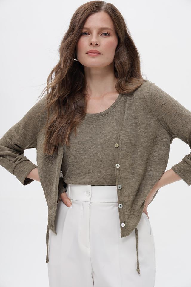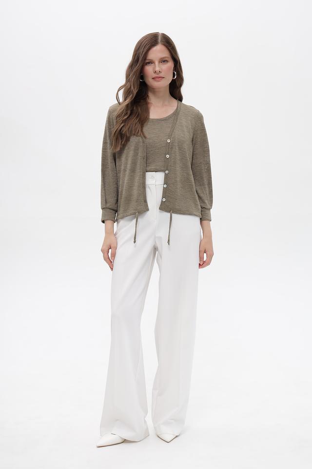 Жакет имеет V-образный вырез и застегивается на три пуговицы. Рукава длиной 3/4 добавляют образу легкости и непринужденности. Боковые завязки позволяют регулировать силуэт и подчеркнуть талию.