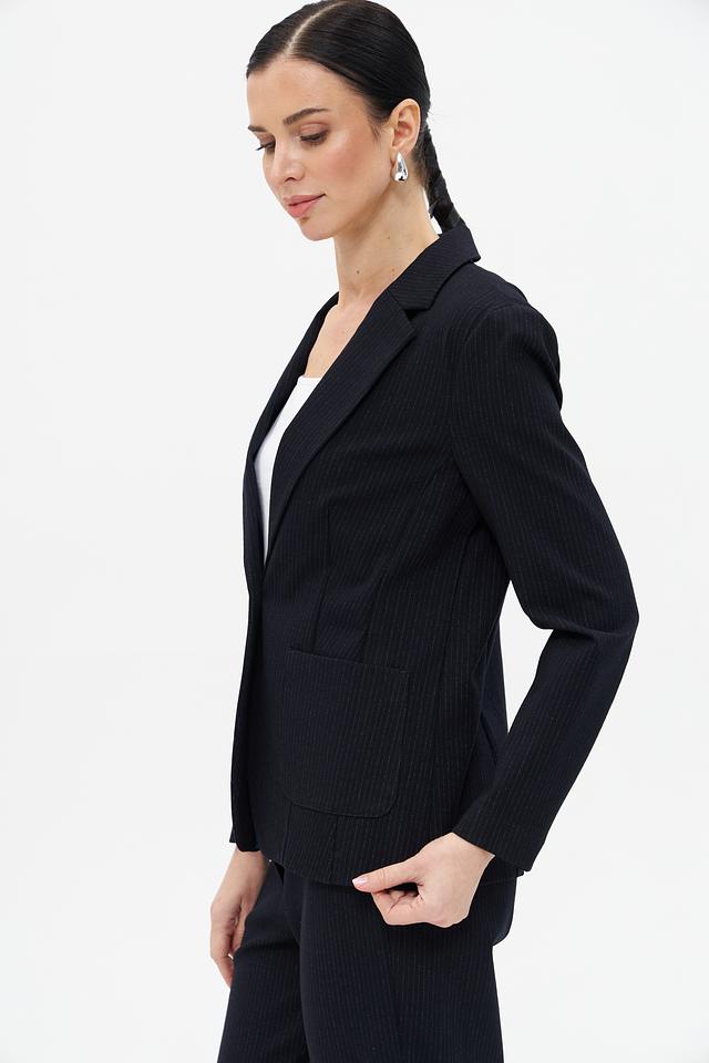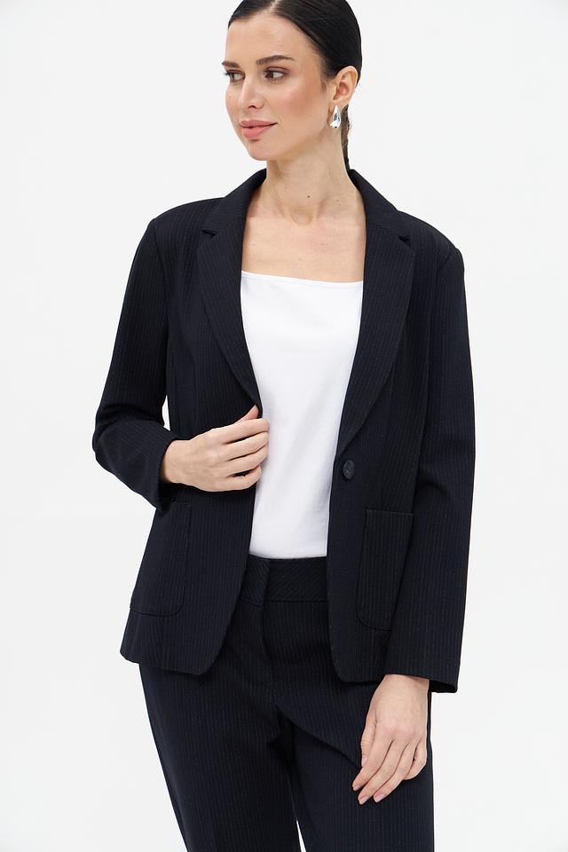 Жакет имеет классический крой с лацканами, застегивается на одну пуговицу. Накладные карманы добавляют практичности. Длинные рукава и приталенный силуэт подчеркивают фигуру.