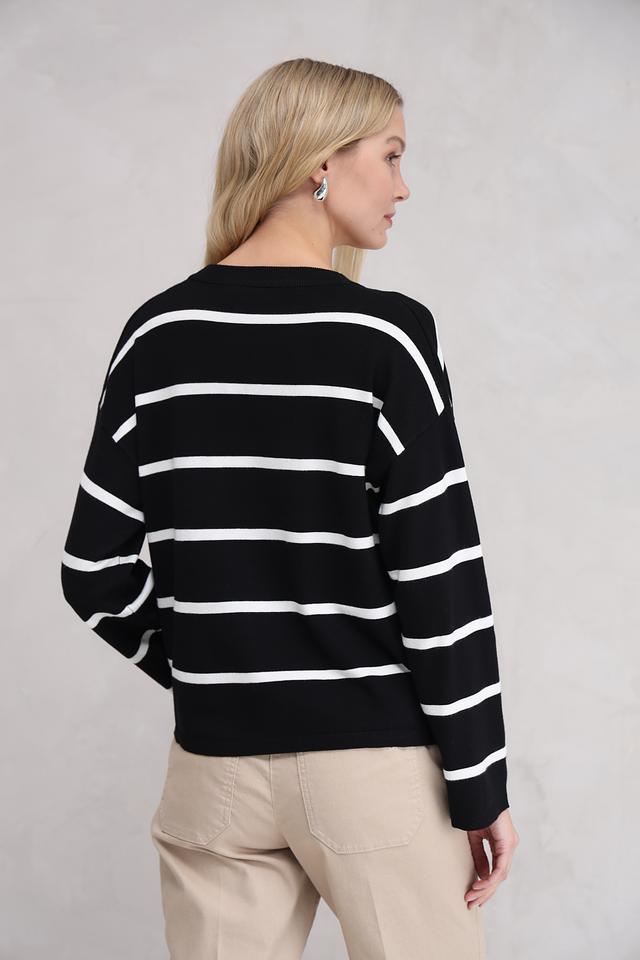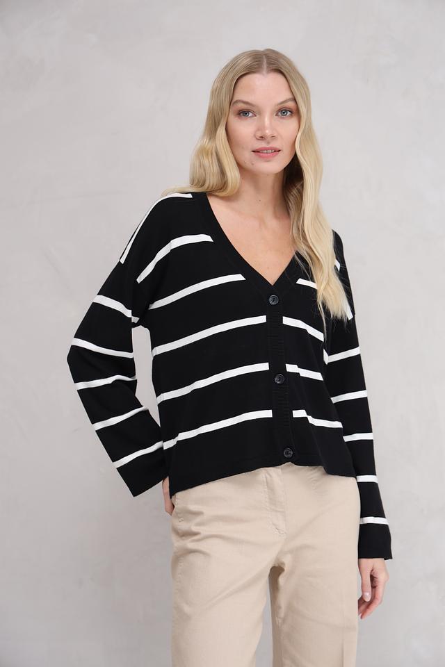 Основной цвет жакета – чёрный, украшен широкими белыми полосами, создающими яркий и динамичный дизайн. Материал – сочетание 70% вискозы и 30% нейлона, что обеспечивает приятные тактильные ощущения и хорошую посадку по фигуре.
