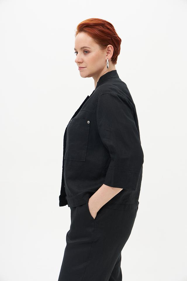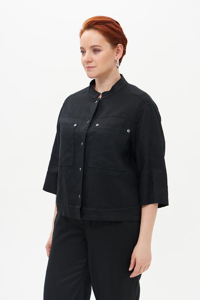 Жакет имеет прямой крой, короткие рукава и воротник-стойку. На передней части расположены два накладных кармана, добавляющие функциональности и стиля. Застёжка выполнена на пуговицах в тон ткани.