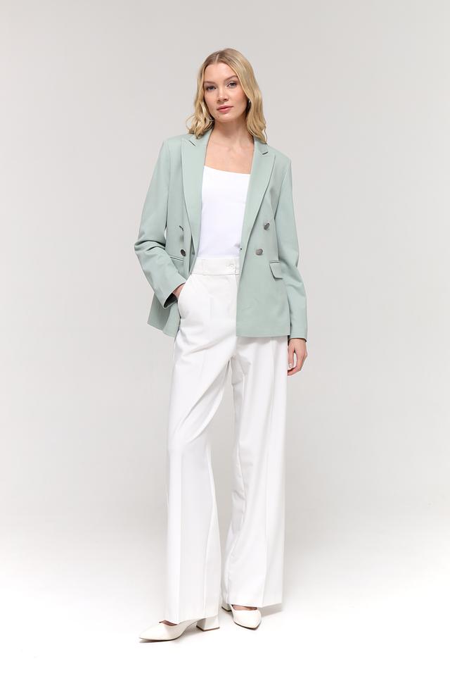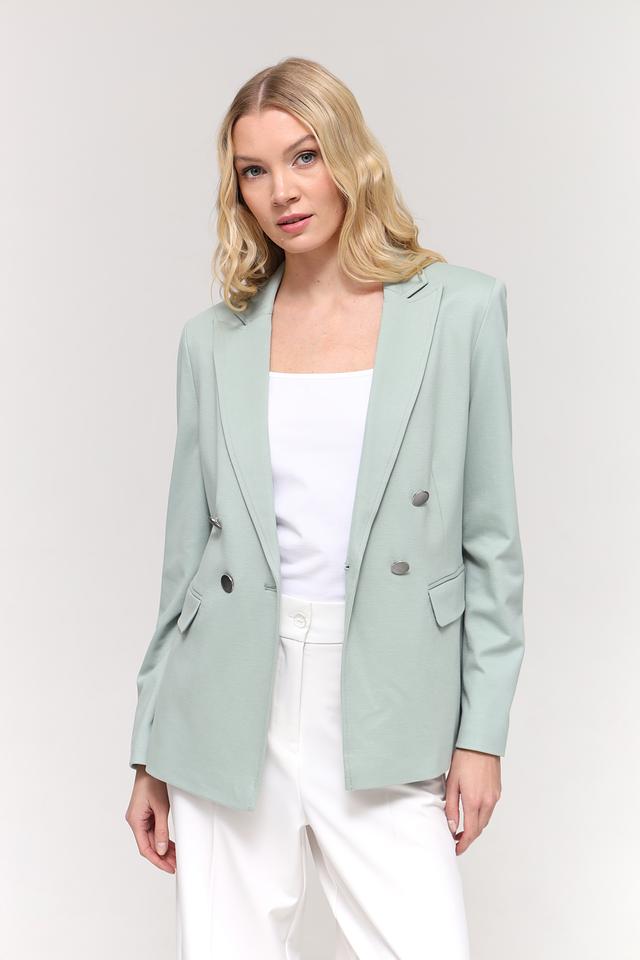 Жакет имеет классический крой с двубортной застежкой на пуговицы. Лацканы пиджачного типа добавляют элегантности. Модель дополнена двумя накладными карманами с клапанами.