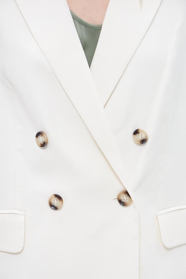 Жакет имеет двубортную застёжку на пуговицах золотистого цвета, которые добавляют изысканности. Лацканы классической формы подчеркивают элегантность силуэта. Модель дополнена двумя накладными карманами с клапанами.