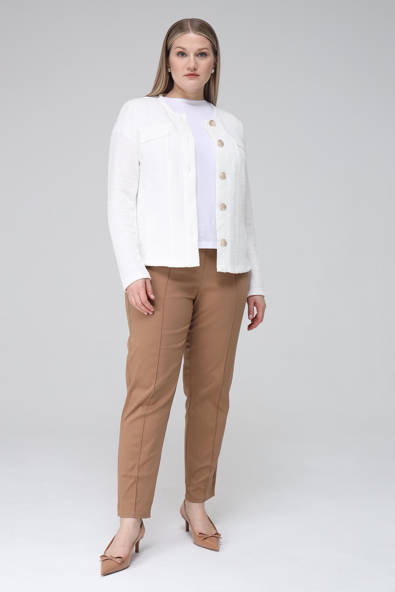 Состав ткани: 20% вискоза, 51% полиэстер, 29% хлопок. Это обеспечивает оптимальное сочетание прочности, мягкости и воздухопроницаемости. Жакет прекрасно держит форму и приятен к телу. Подходит для создания как деловых, так и повседневных образов.
