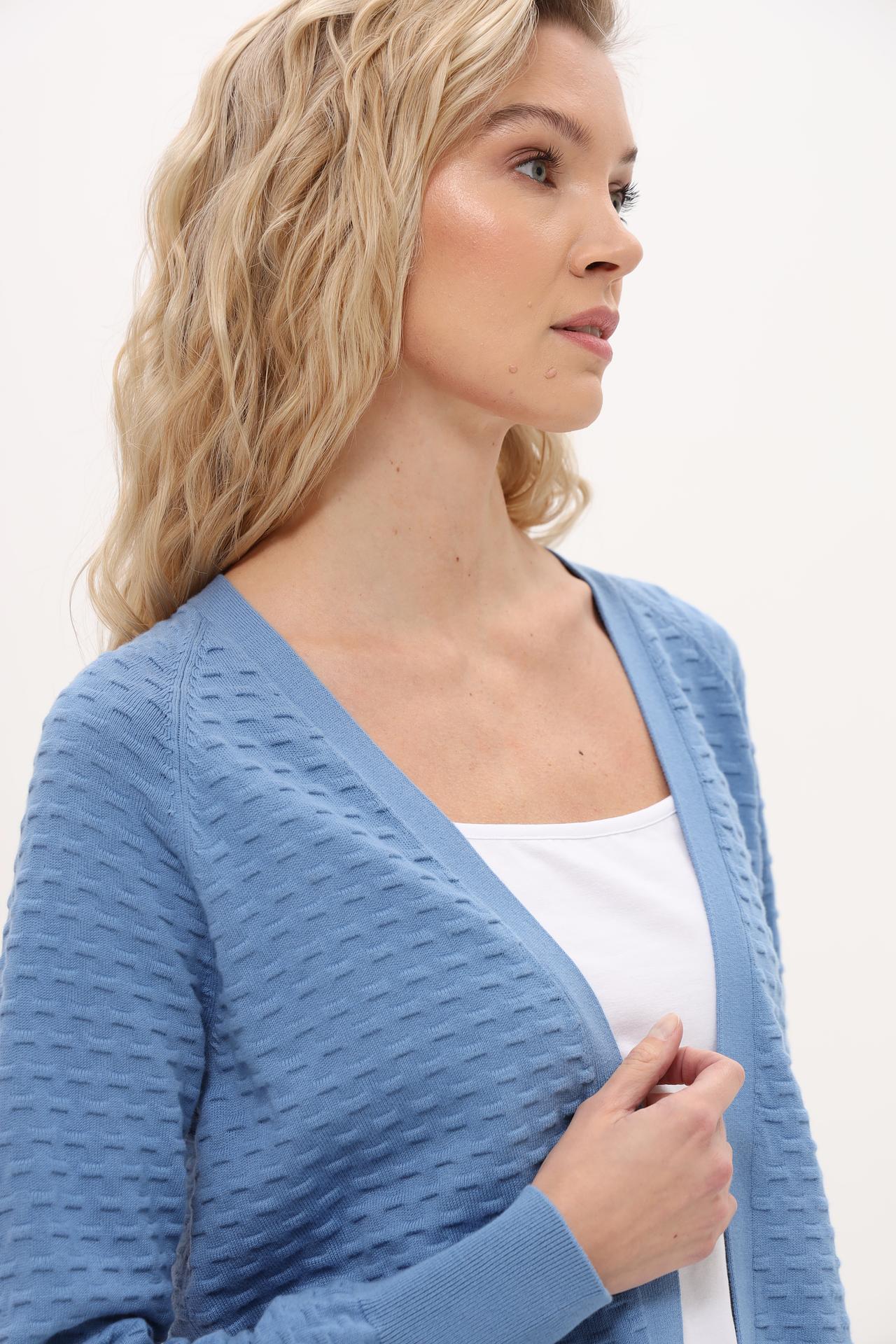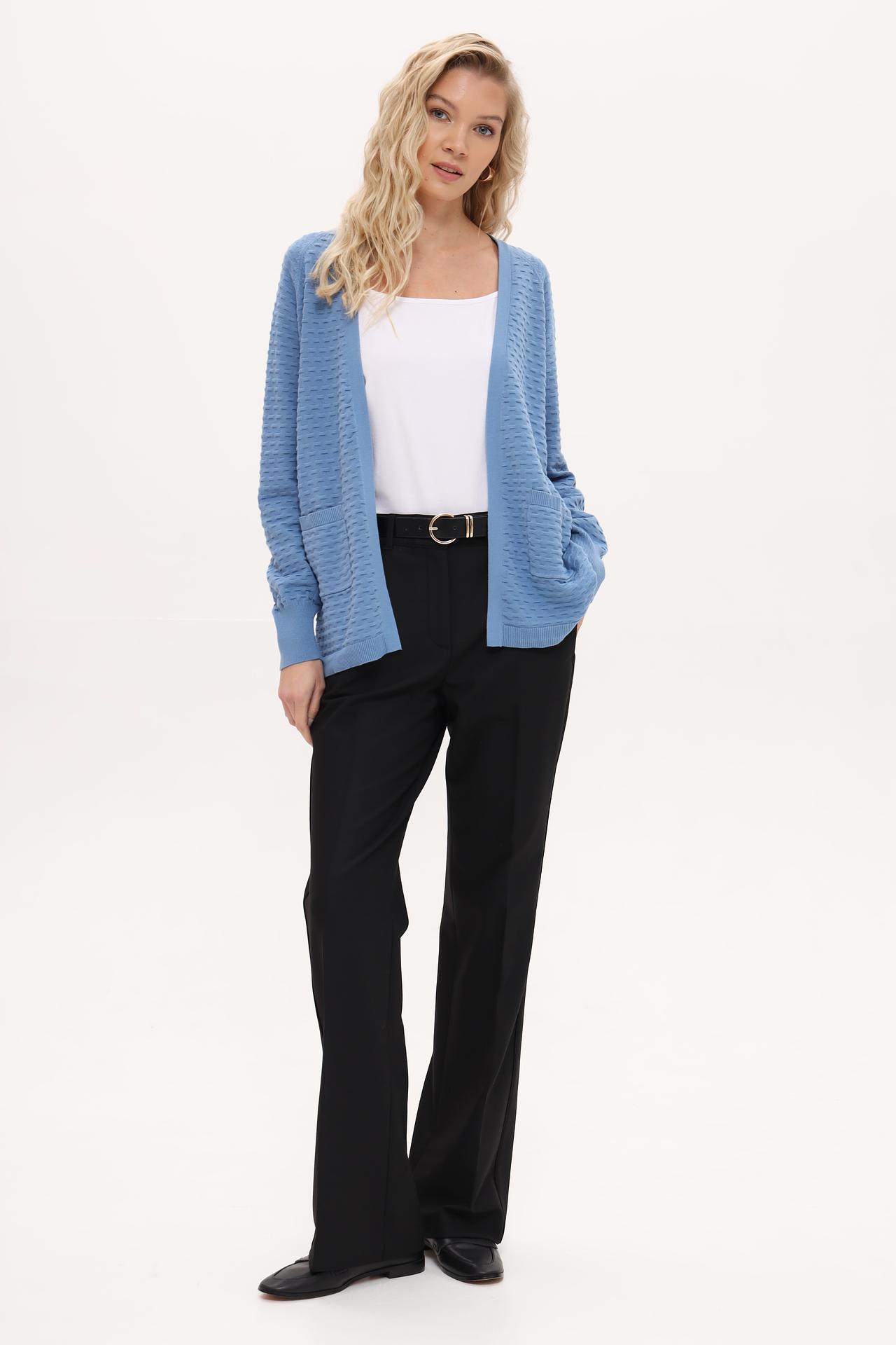 - Стильный дизайн: Однотонный голубой цвет и рельефная вязка с мелким геометрическим рисунком добавляют современный акцент. Отсутствие застежек подчеркивает свободный и расслабленный стиль жакета.