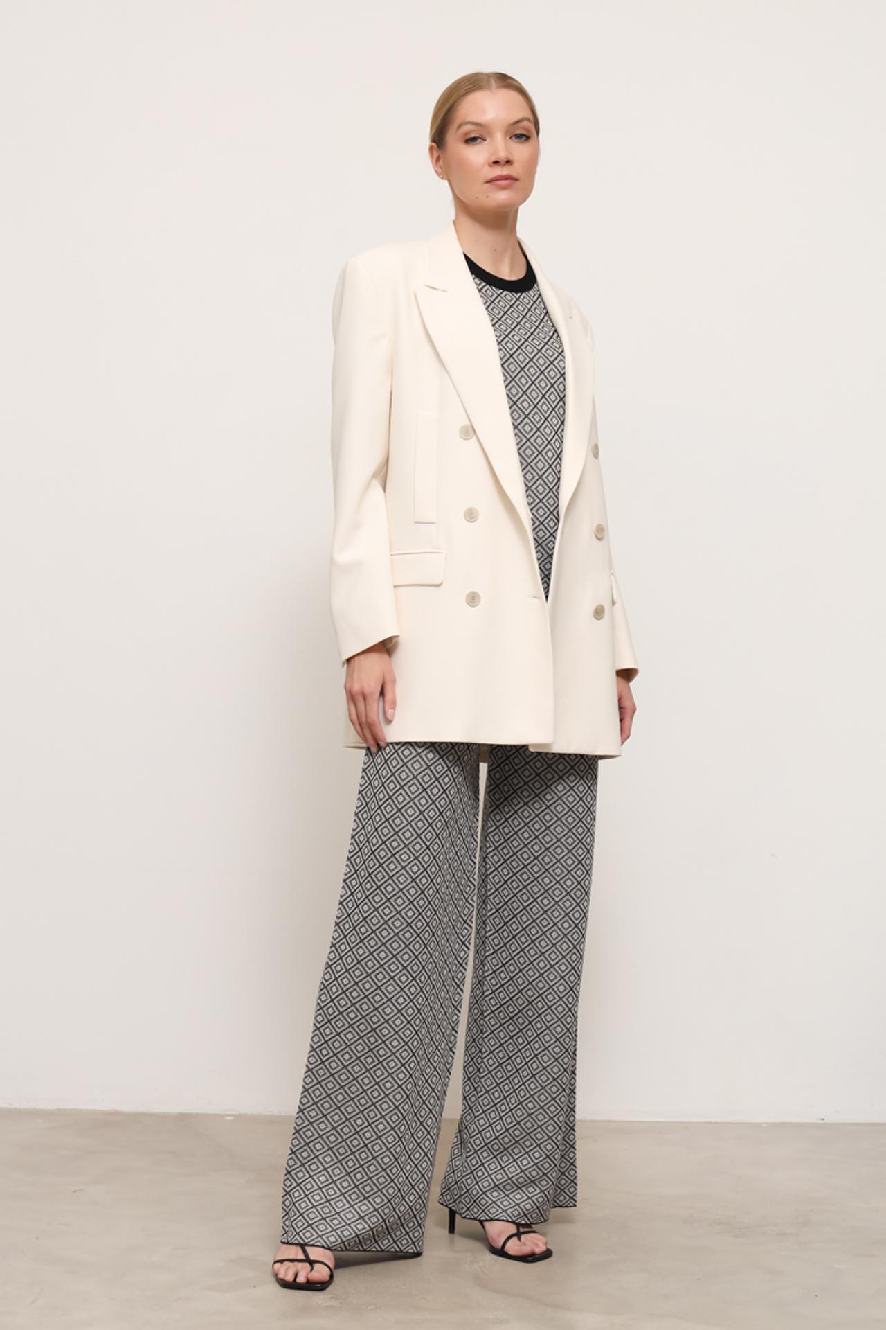 - Двубортный дизайн: Классический и элегантный элемент, который всегда в моде и придает образу завершенность.