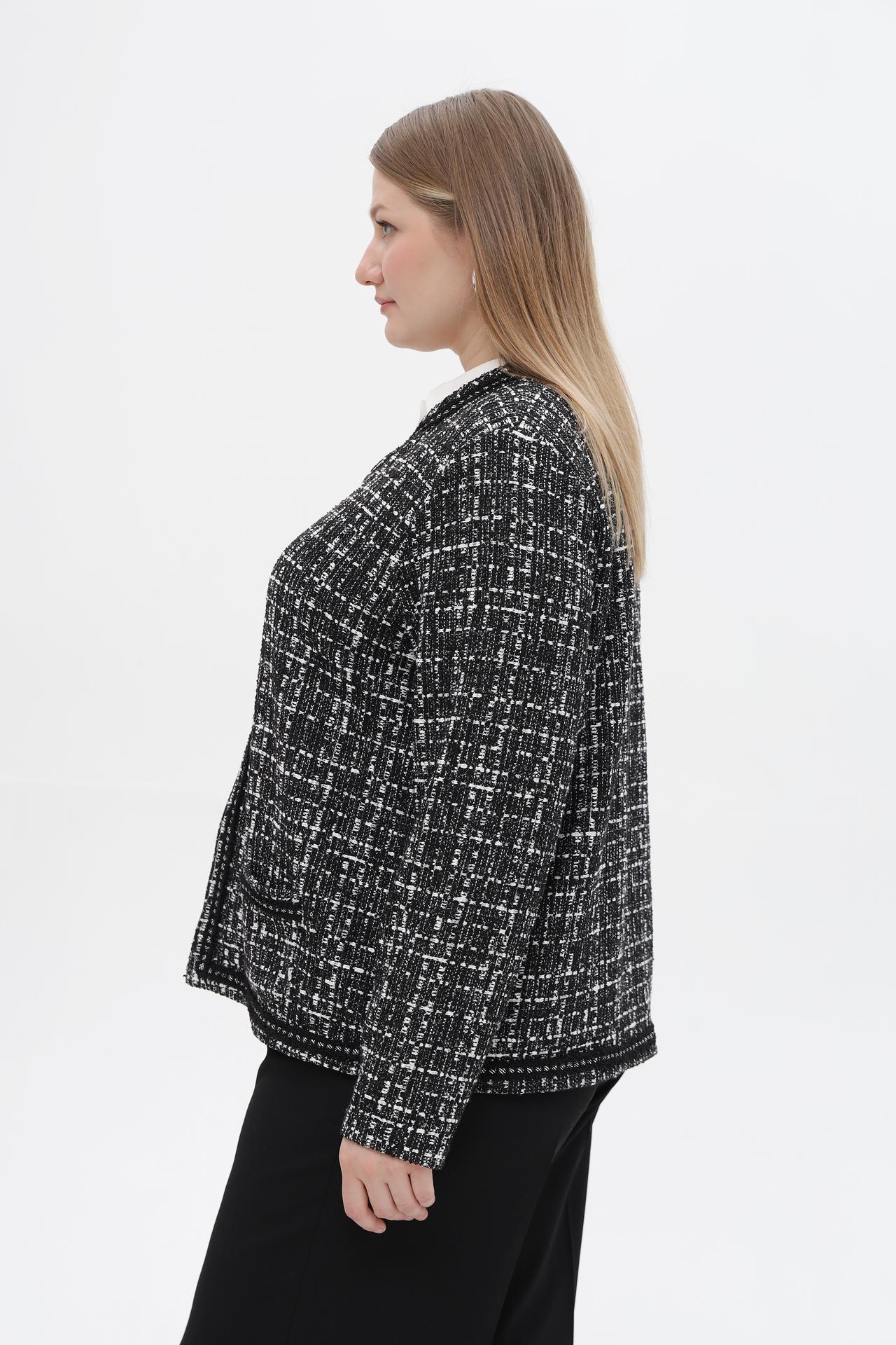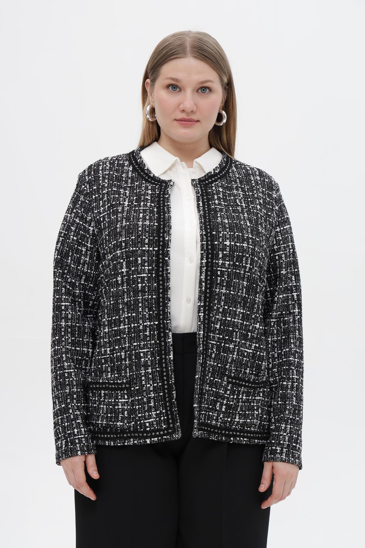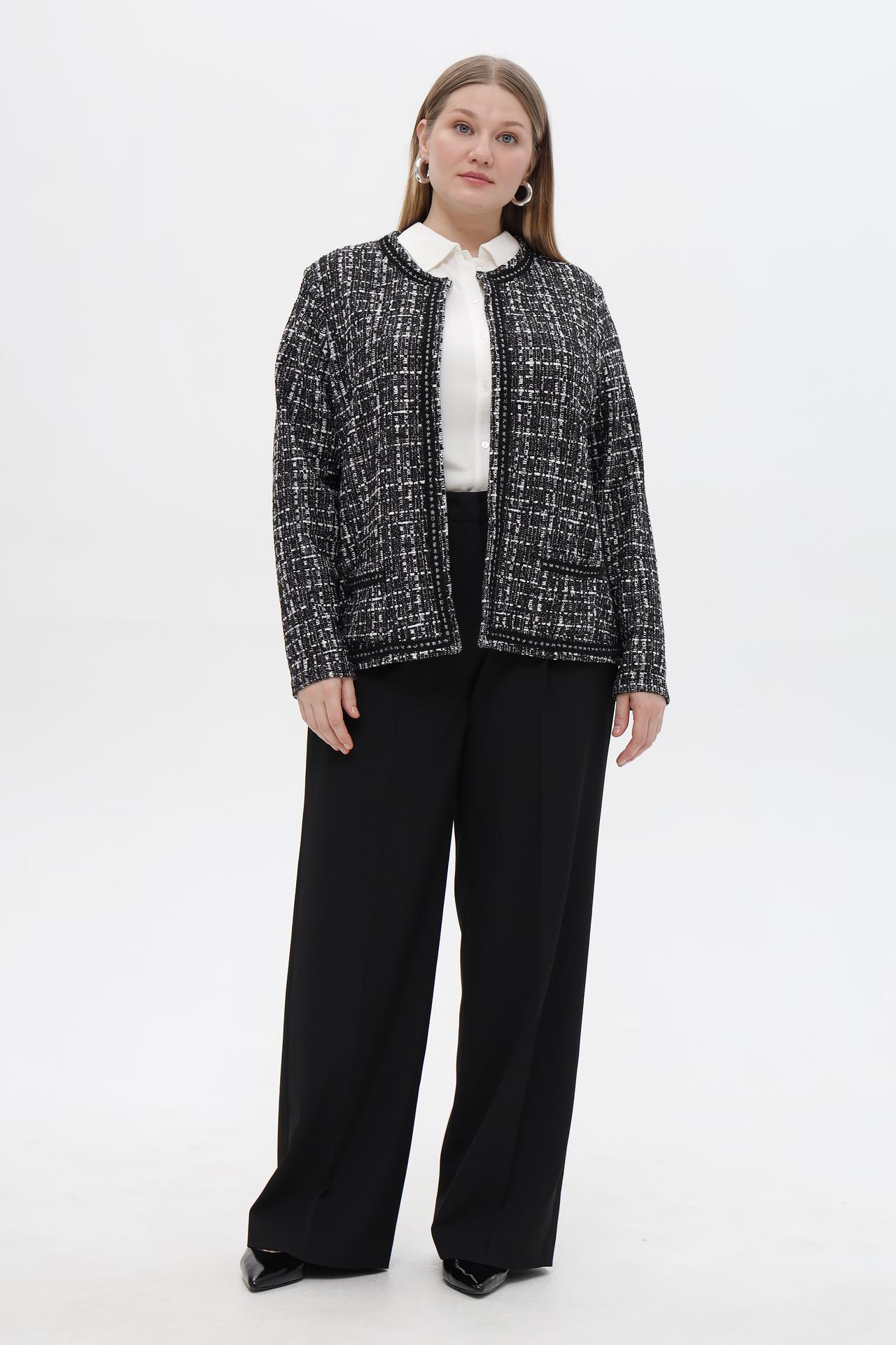 - Дизайн: Классический крой с круглым вырезом и накладными карманами. Твидовая фактура в клетку и декоративная отделка добавляют изделию утонченности.