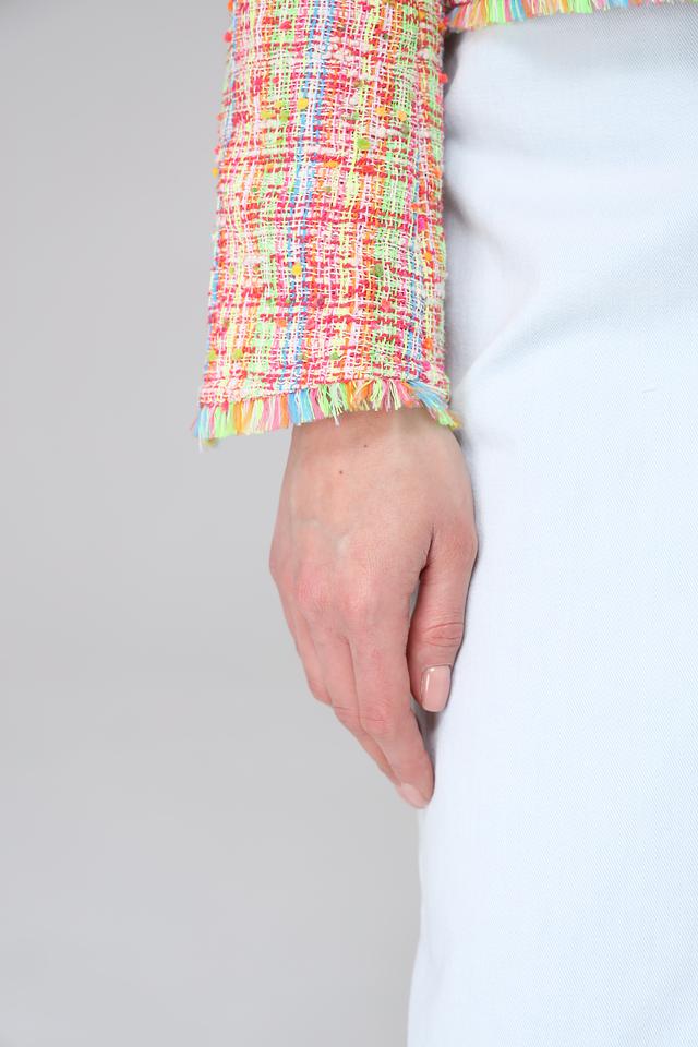 Жакет имеет короткий рукав и классический силуэт. Отделка по краям изделия выполнена в виде бахромы, что придает ему легкость и динамичность.