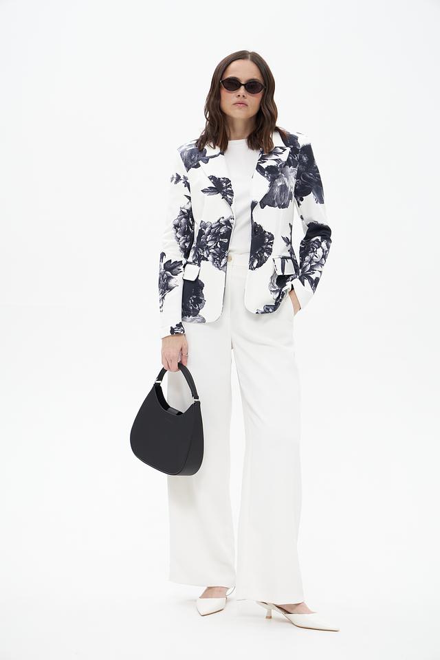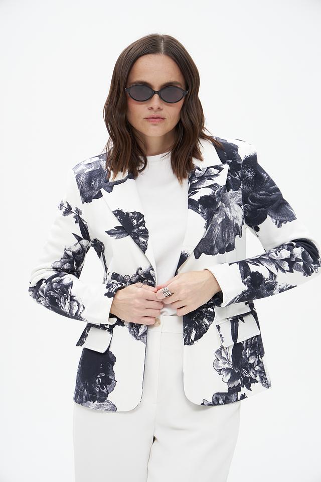Жакет имеет классический крой с лацканами и застежкой на одну пуговицу. Длинные рукава дополнены тем же цветочным принтом, что и основная часть жакета. Изготовлен из высококачественного 100% хлопка, что обеспечивает комфорт в носке и приятные тактильные ощущения.
