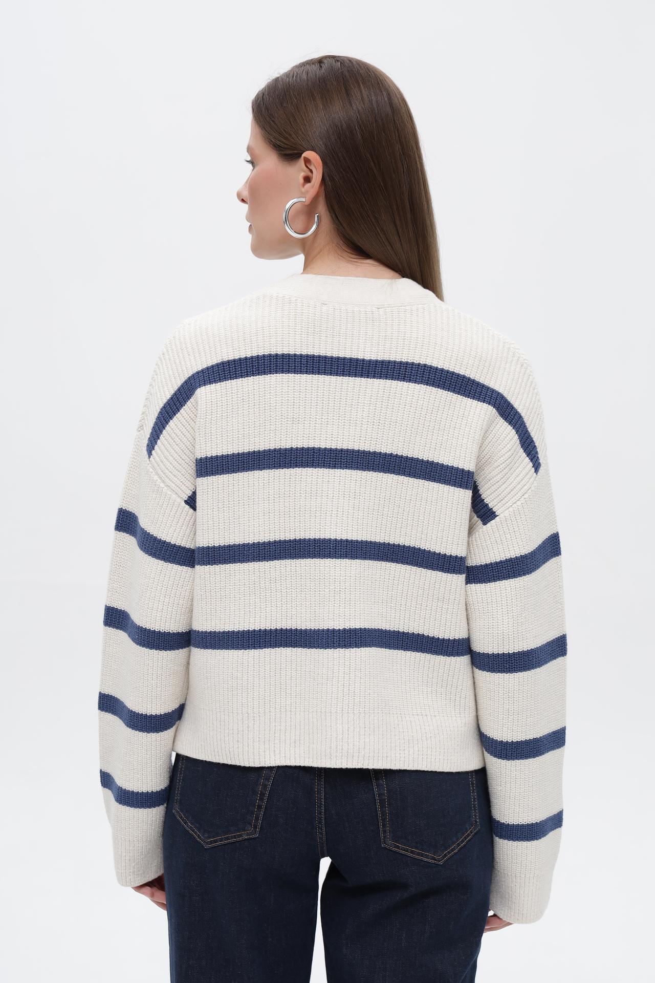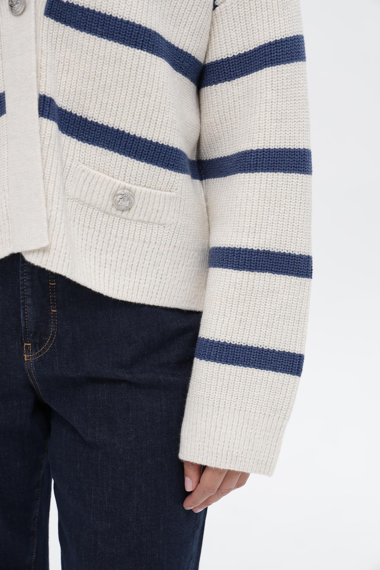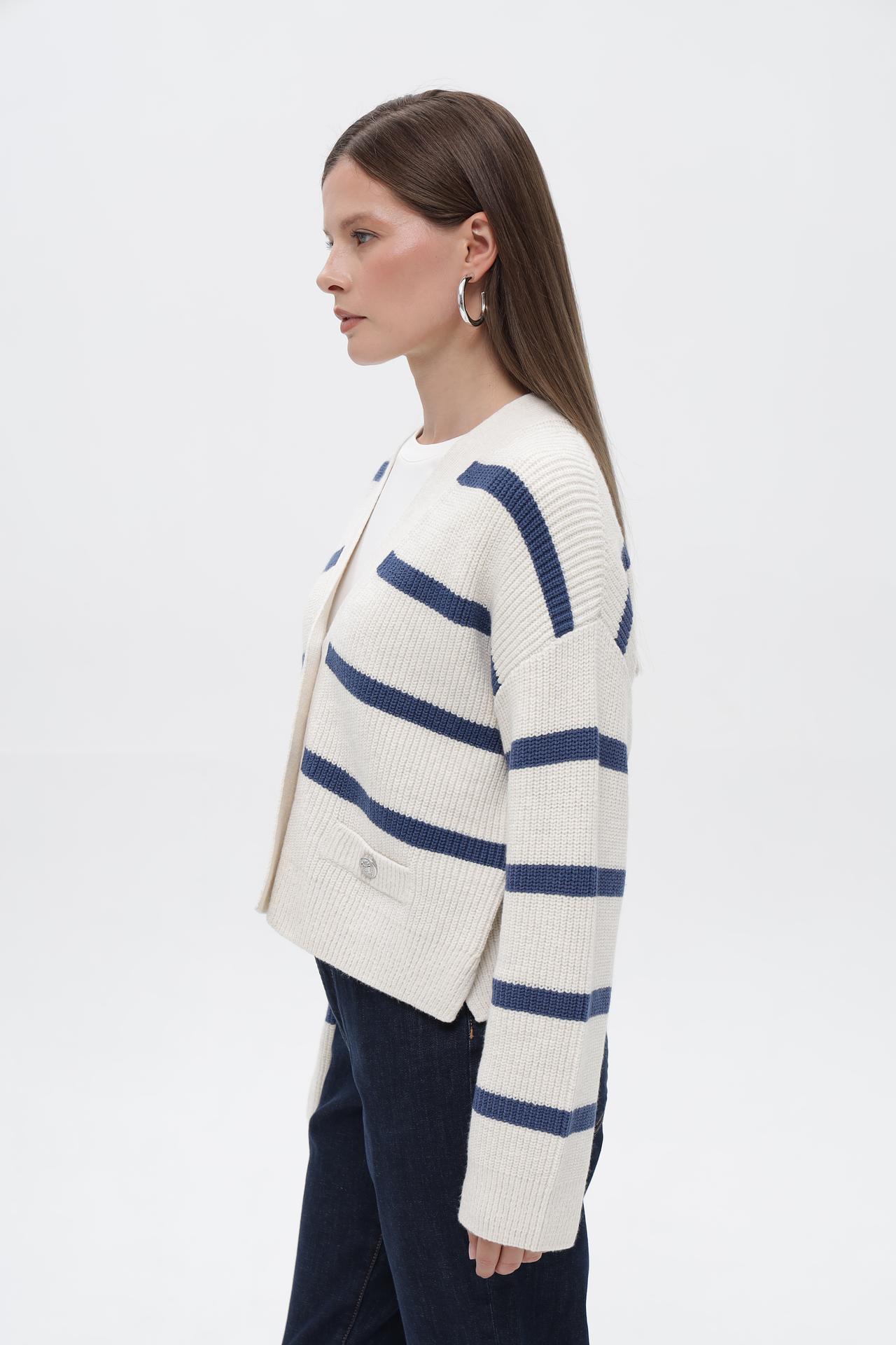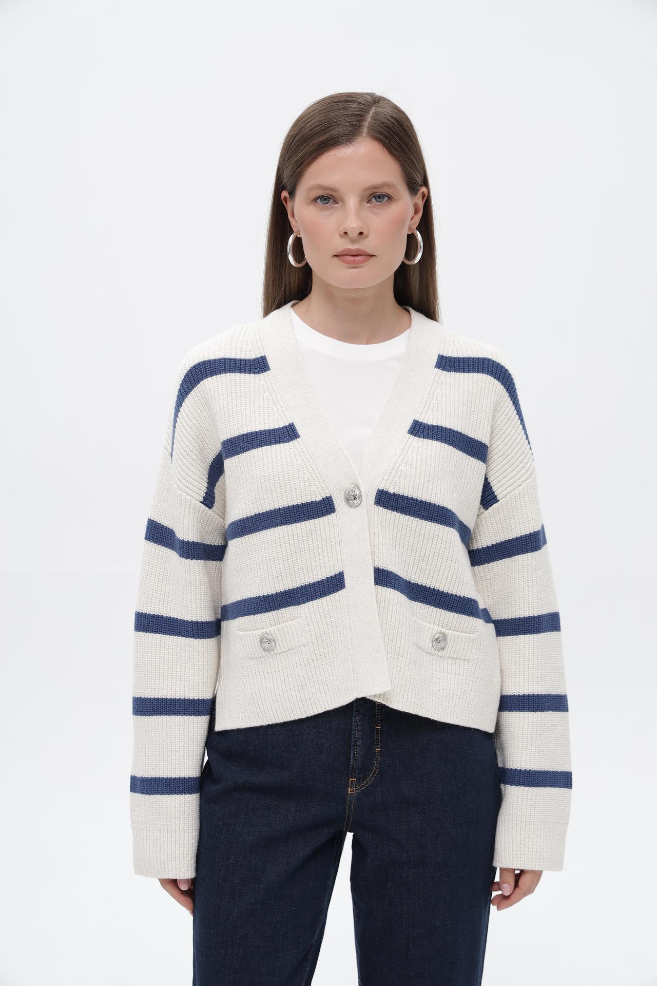 - Модный дизайн. Классическая морская полоска, укороченный крой и V-образный вырез делают этот полосатый жакет актуальным трендом. Декоративные пуговицы добавляют изысканности образу.