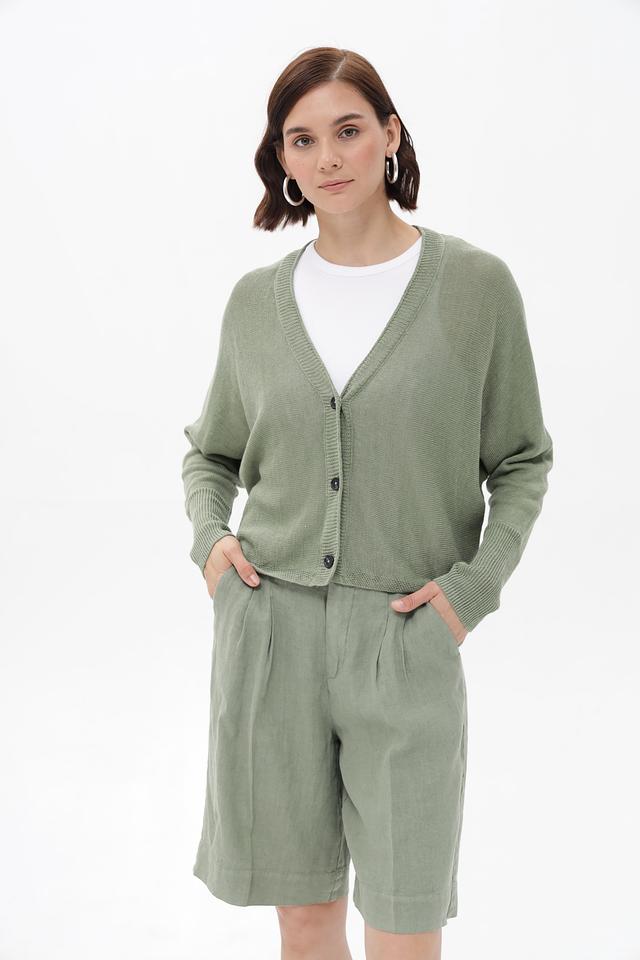 Кардиган выполнен из 100% льна, что обеспечивает комфорт и воздухопроницаемость в теплую погоду. Приталенный силуэт подчеркивает фигуру, а манжеты на рукавах придают изделию аккуратный вид.
