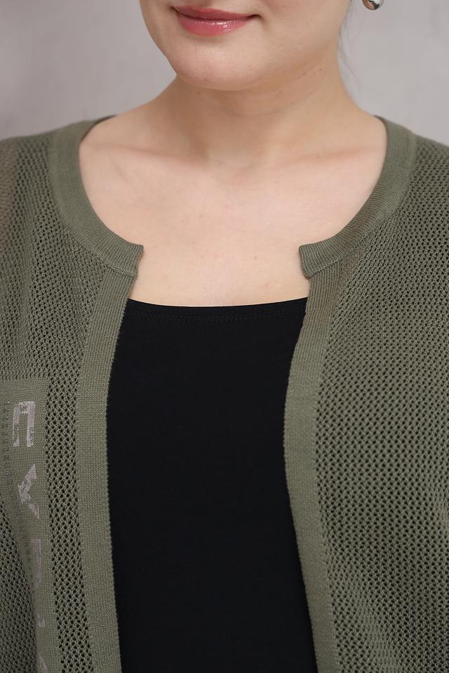 Жакет имеет длинные рукава и открытый фасад, что делает его идеальным для создания многослойных образов. Декоративные надписи по бокам добавляют изделию оригинальности и стиля.