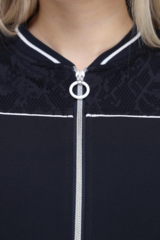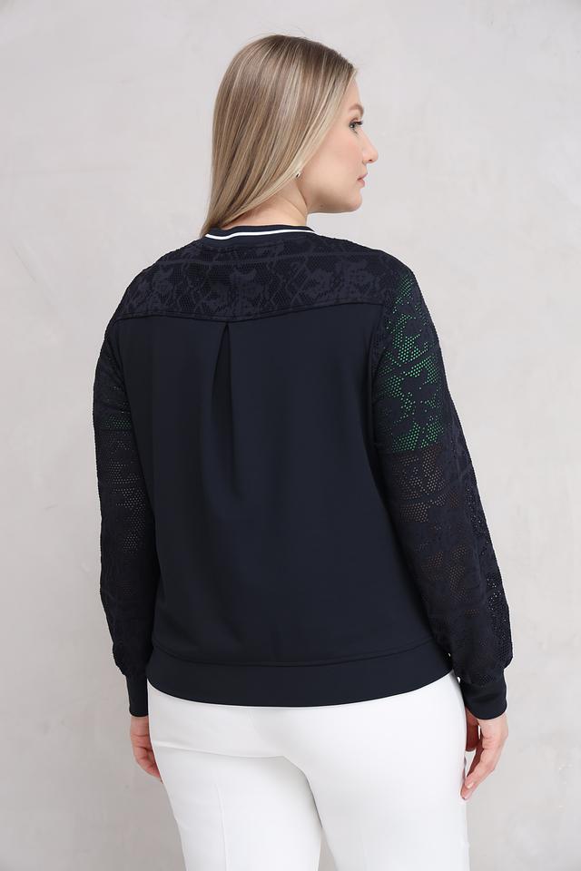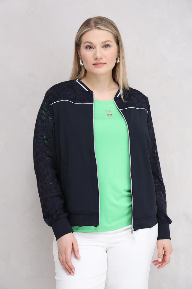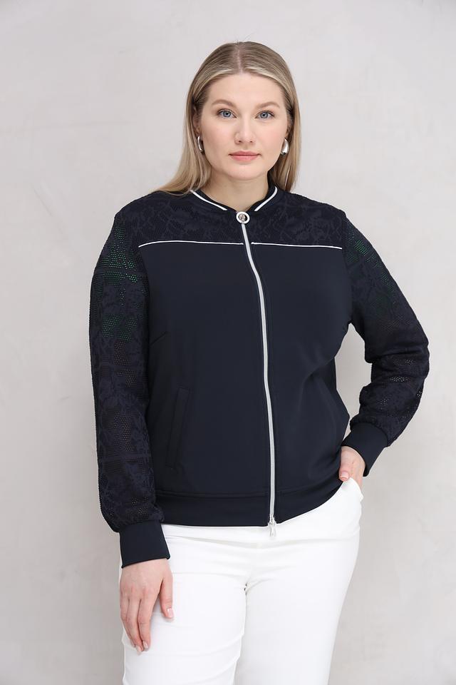 Особенностью модели являются рукава, выполненные из изысканного кружева, что придает жакету элегантность и женственность. Белая отделка по молнии и карманам добавляет контраста и подчеркивает современный дизайн.