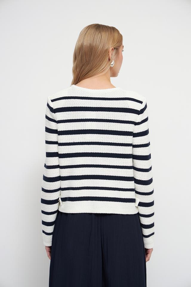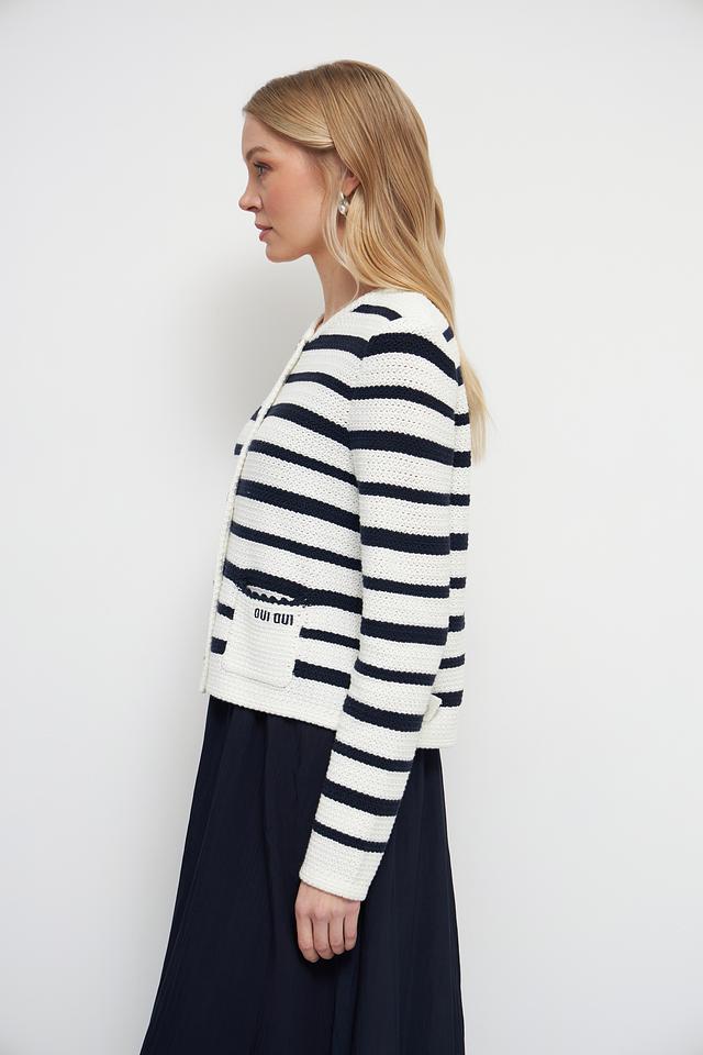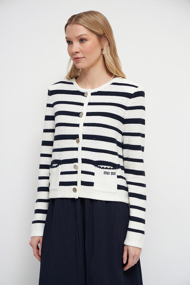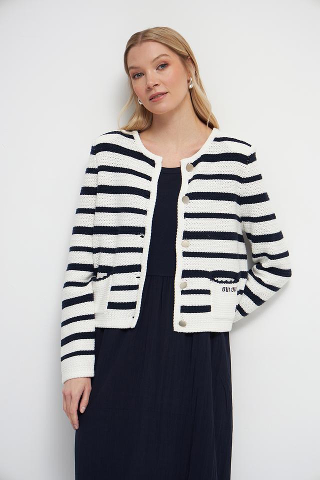 Этот жакет от Oui станет отличным дополнением к вашему гардеробу. Модель выполнена в полосатом дизайне, сочетающем белый и тёмно-синий цвета, что придает ей свежий и современный вид.