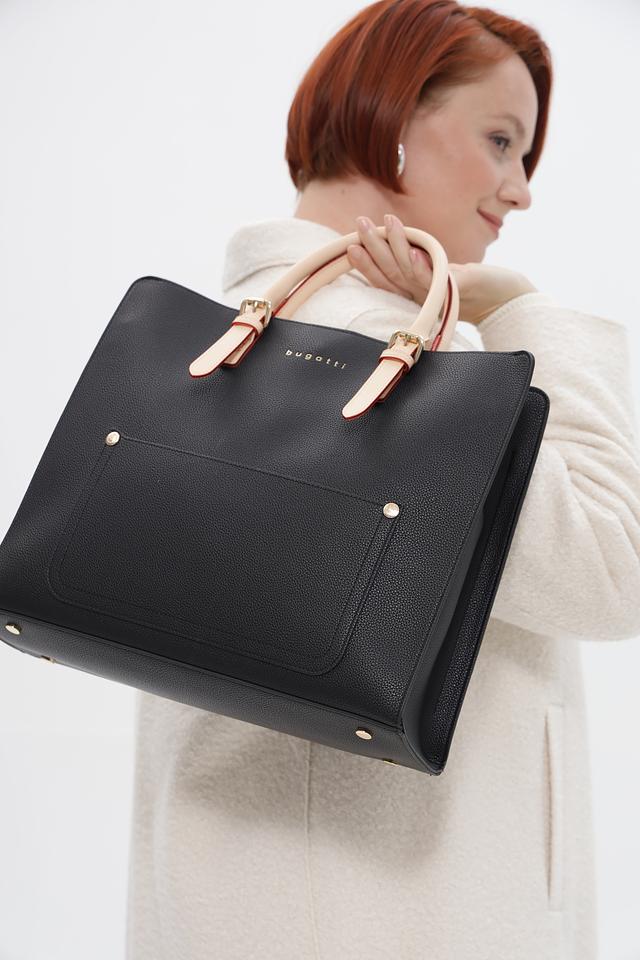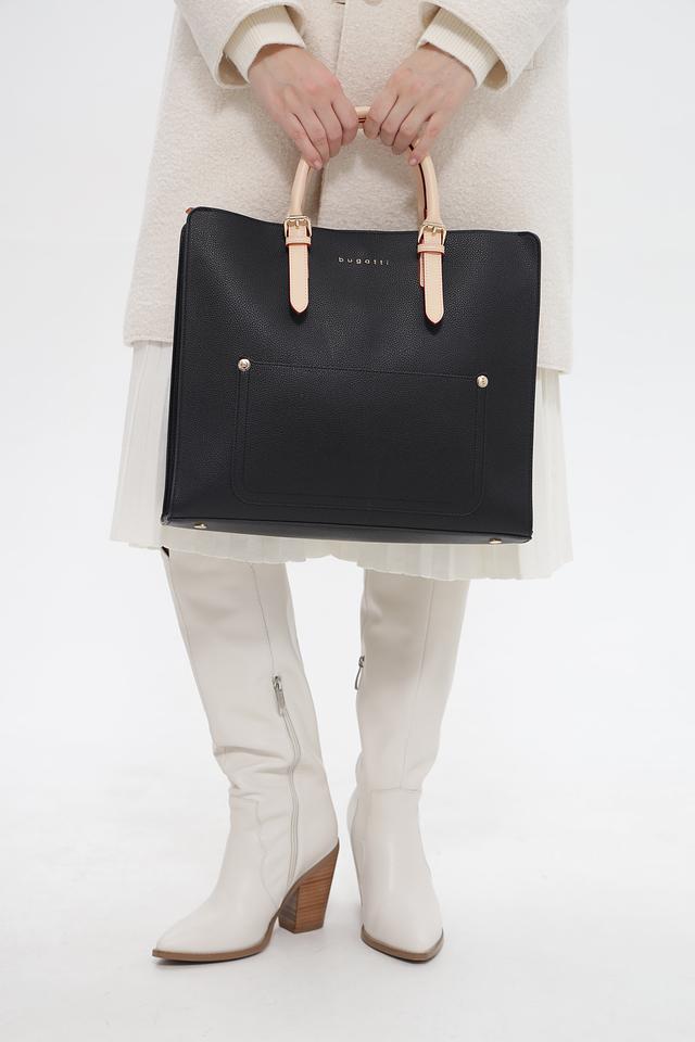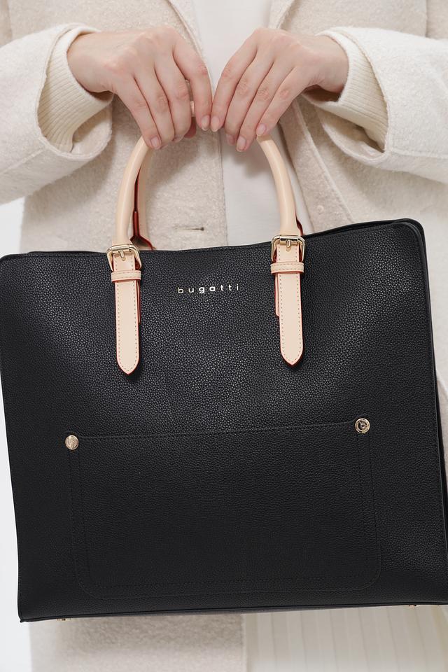 Стильная женская сумка Bugatti черного цвета с элегантными ручками бежевого оттенка. Изготовлена из высококачественного полиуретана, практична и долговечна. Состав: полиуретан 100%