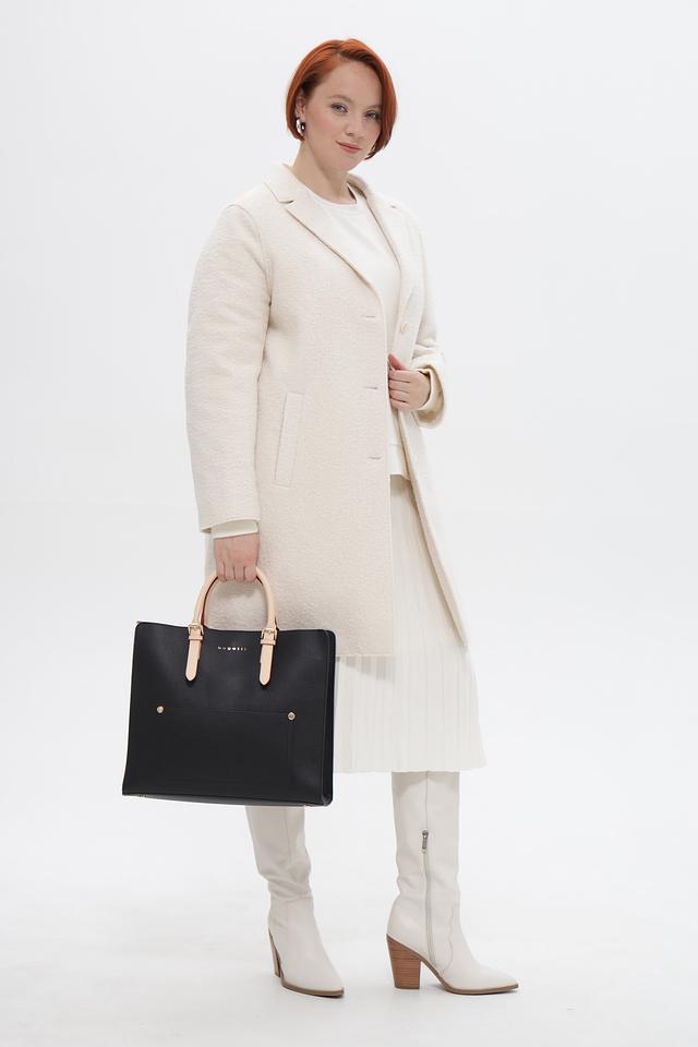 Сумка имеет прямоугольную форму и достаточно вместительное основное отделение, в которое легко поместятся документы формата А4 и другие необходимые вещи. Удобные ручки бежевого цвета позволяют носить сумку в руке. На передней панели расположен практичный накладной карман для быстрого доступа к мелочам.