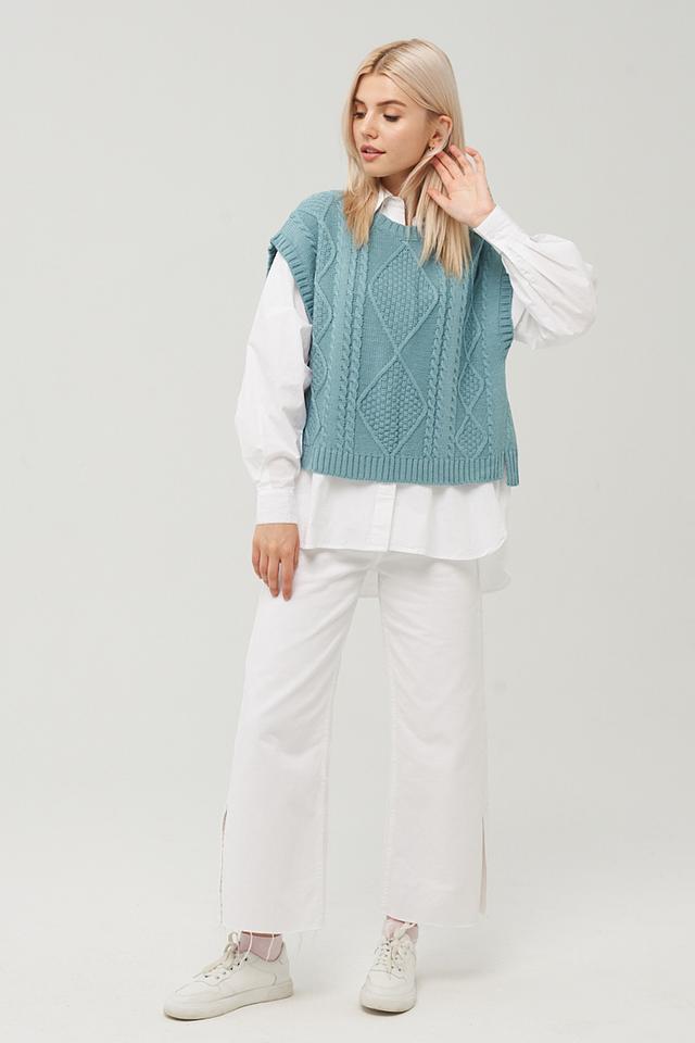Жилет выполнен в приятном бирюзовом цвете и имеет фактурный узор «косы», придающий ему особый шарм. Он имеет прямой, свободный крой, который не сковывает движения и обеспечивает комфорт при носке.