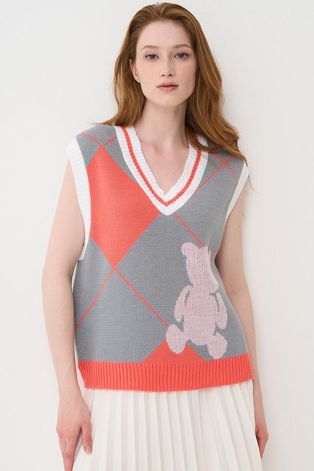 Жилет имеет V-образный вырез и свободный крой, что обеспечивает комфортную посадку по фигуре. Оригинальный принт в виде милого медвежонка добавляет образу игривости и индивидуальности.
