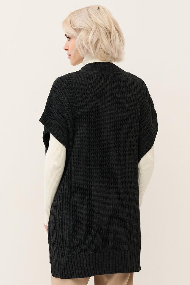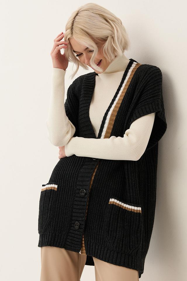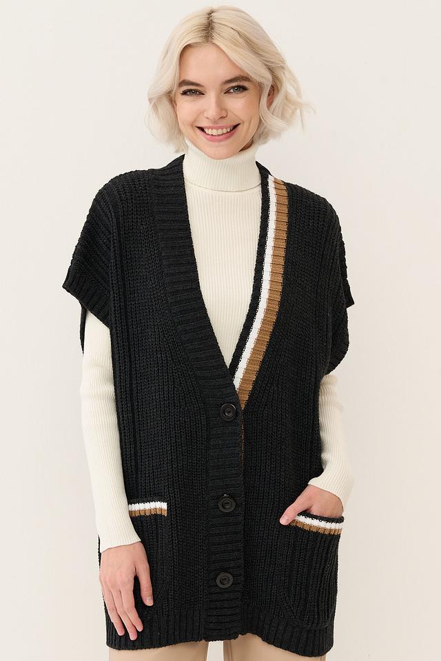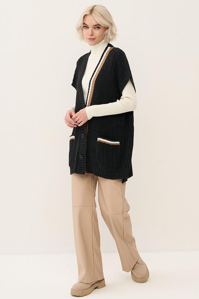 Жилет имеет свободный крой, V-образный вырез и застегивается на пуговицы по всей длине. На передней части расположены два удобных кармана, также оформленные полосками. Модель выполнена из смесового материала, содержащего 30% шерсти и 70% полиакрила, что обеспечивает мягкость, тепло и простоту в уходе.
