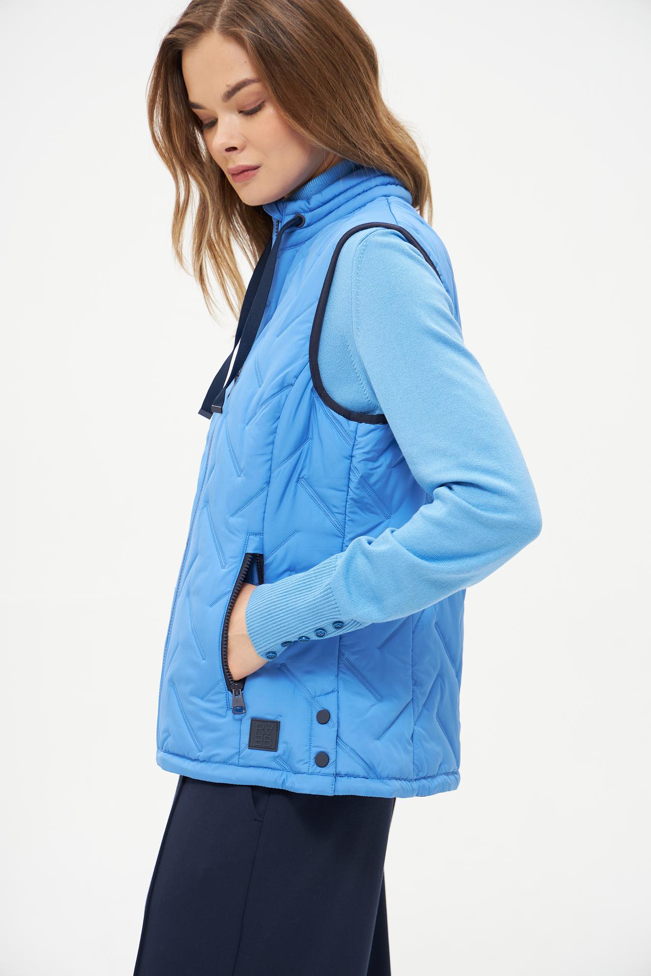 Модель отличается современным дизайном с эффектной стежкой в виде зигзагов. Прямой крой обеспечивает безупречную посадку, а лаконичный дизайн делает жилет универсальным элементом гардероба.