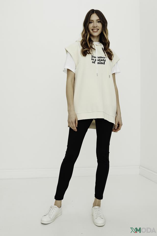 Жилет имеет свободный крой, который обеспечивает комфорт в носке, а удлиненный силуэт визуально вытягивает фигуру. На передней части изделия размещен яркий принт с надписью "Summer is a state of mind", который подчеркивает летнее настроение.