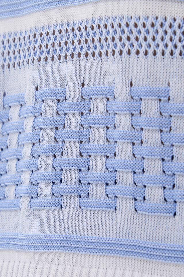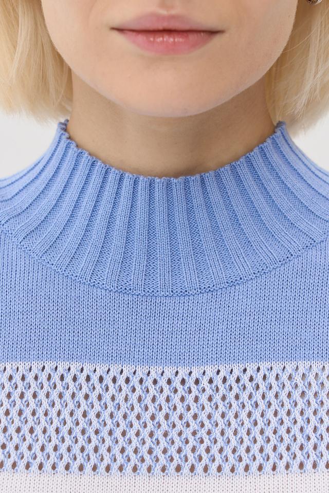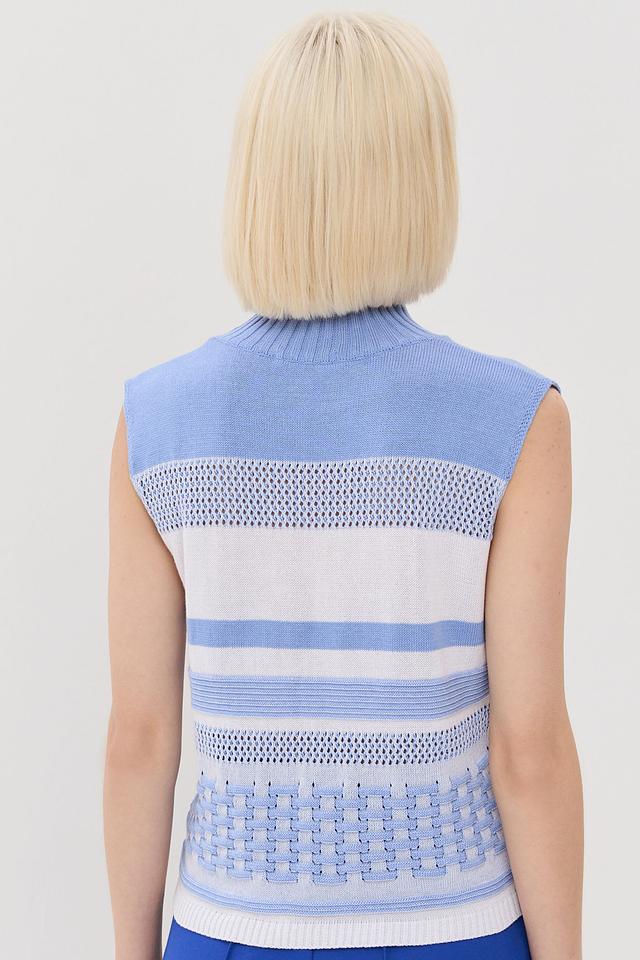 Женский жилет VAY голубого цвета с полосатым узором и оригинальным плетением. Модель имеет высокий воротник-стойку и без рукавов, что делает ее универсальным дополнением к образу. Состав: