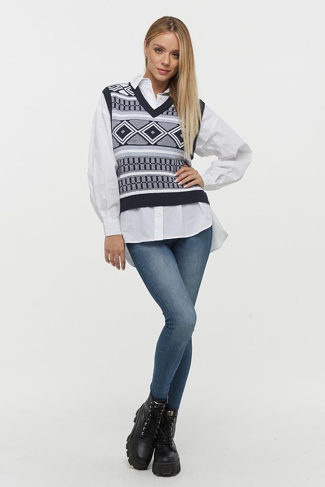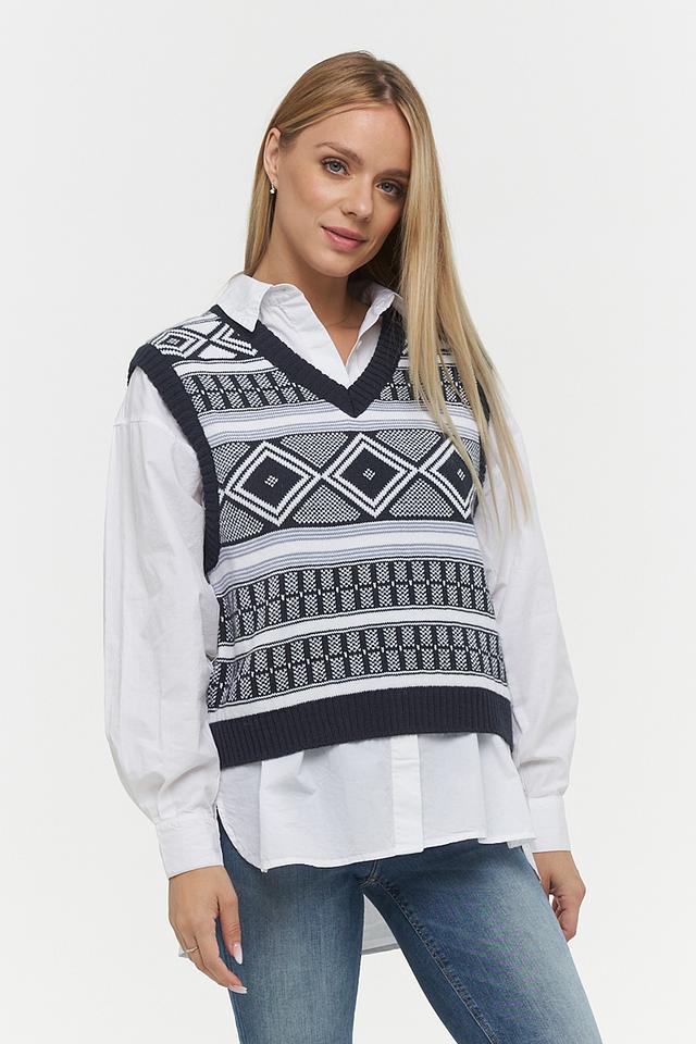 Этот жилет от VAY – отличный выбор для создания многослойных образов. Он выполнен в темно-синем цвете и украшен выразительным геометрическим узором, сочетающим в себе белый и серый оттенки.