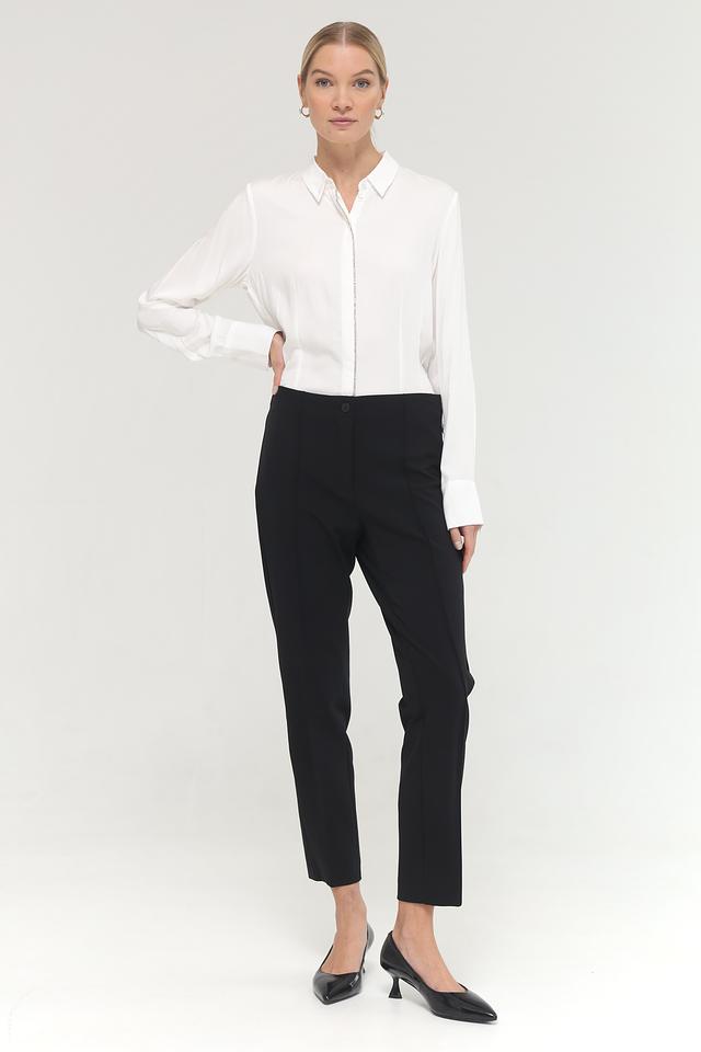 Брюки имеют прямой крой и стандартную посадку по талии. Застежка на пуговицу и молнию обеспечивает надежную фиксацию. Ткань, состоящая из 88% полиамида и 12% эластана, приятна на ощупь, хорошо держит форму и обеспечивает комфорт при носке.